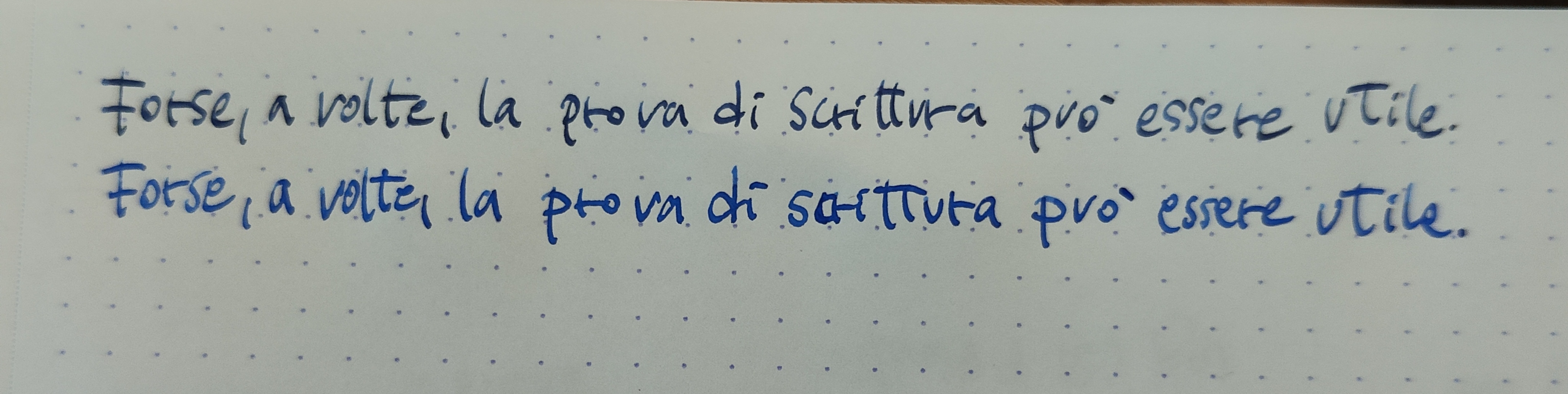 non sono abbastanza malato da misurare i grammi e so che ti riferisci a pennini flessibili, ma le mie prove di scrittura (ad uso personale) riportano il tratto con pressione minima e quello da penna a sfera (nell'uso normale sara' compreso tra i due). ne ho postata recentemente qualcuna qui, ma non era per una vendita. sono su rhodia, sempre lo stesso set di caratteri, a stampatello (per lo shading) ed in corsivo (per eventuali salti nell'uso piu' rapido), figure geometriche (per la variazione di tratto in diverse direzioni)piccardi ha scritto: ↑martedì 10 gennaio 2023, 22:16Mai vista una prova in cui si dice quanta pressione. Che è informazione fondamentale. dato che ho visto chiamare flessibili (perché chi li usava premeva dannatamente, leggi più di 200gr) pennini che al più considererei molleggiati. A me quelle righe e quegli 8 non dicono mai nulla di significativo.