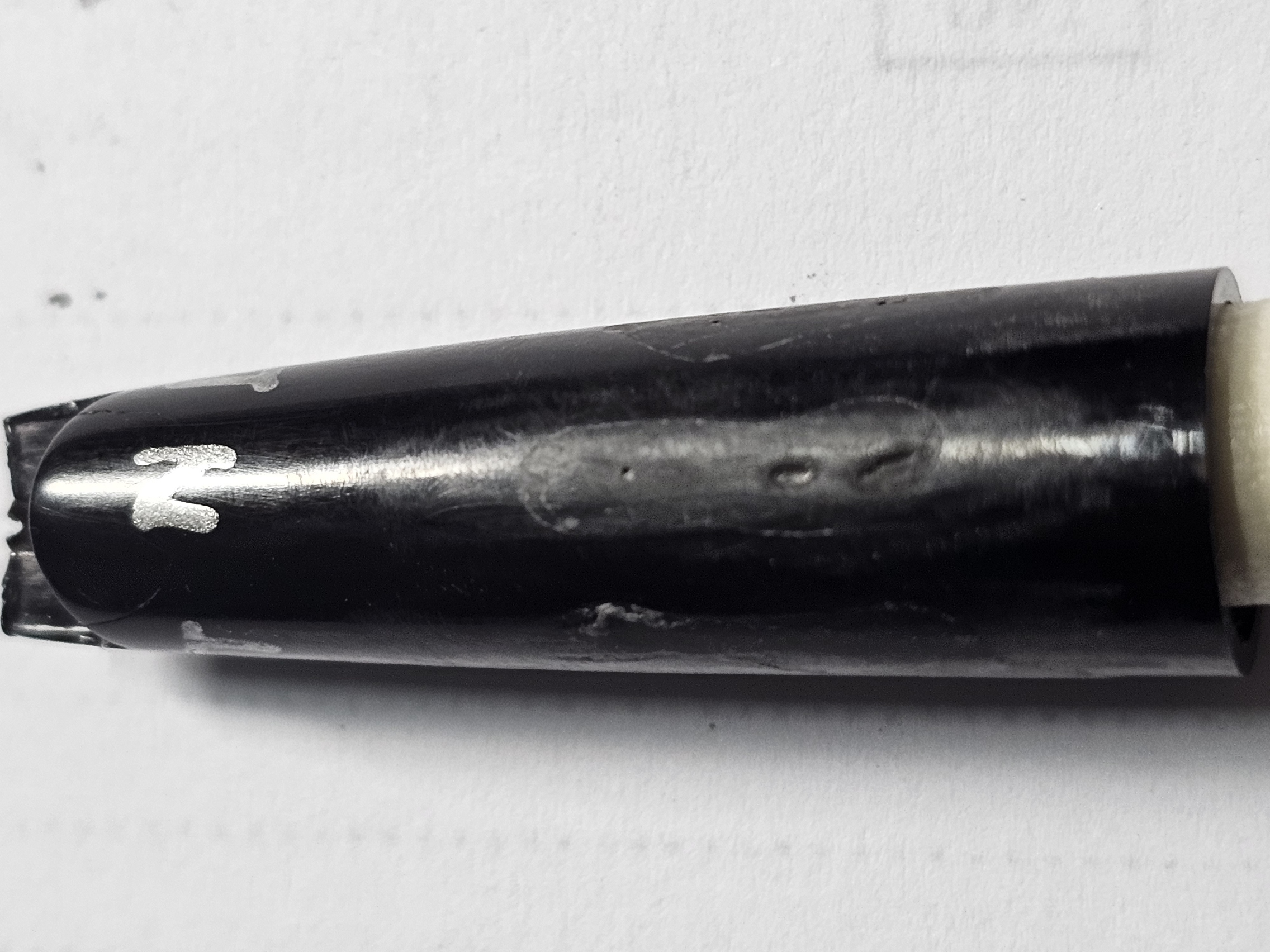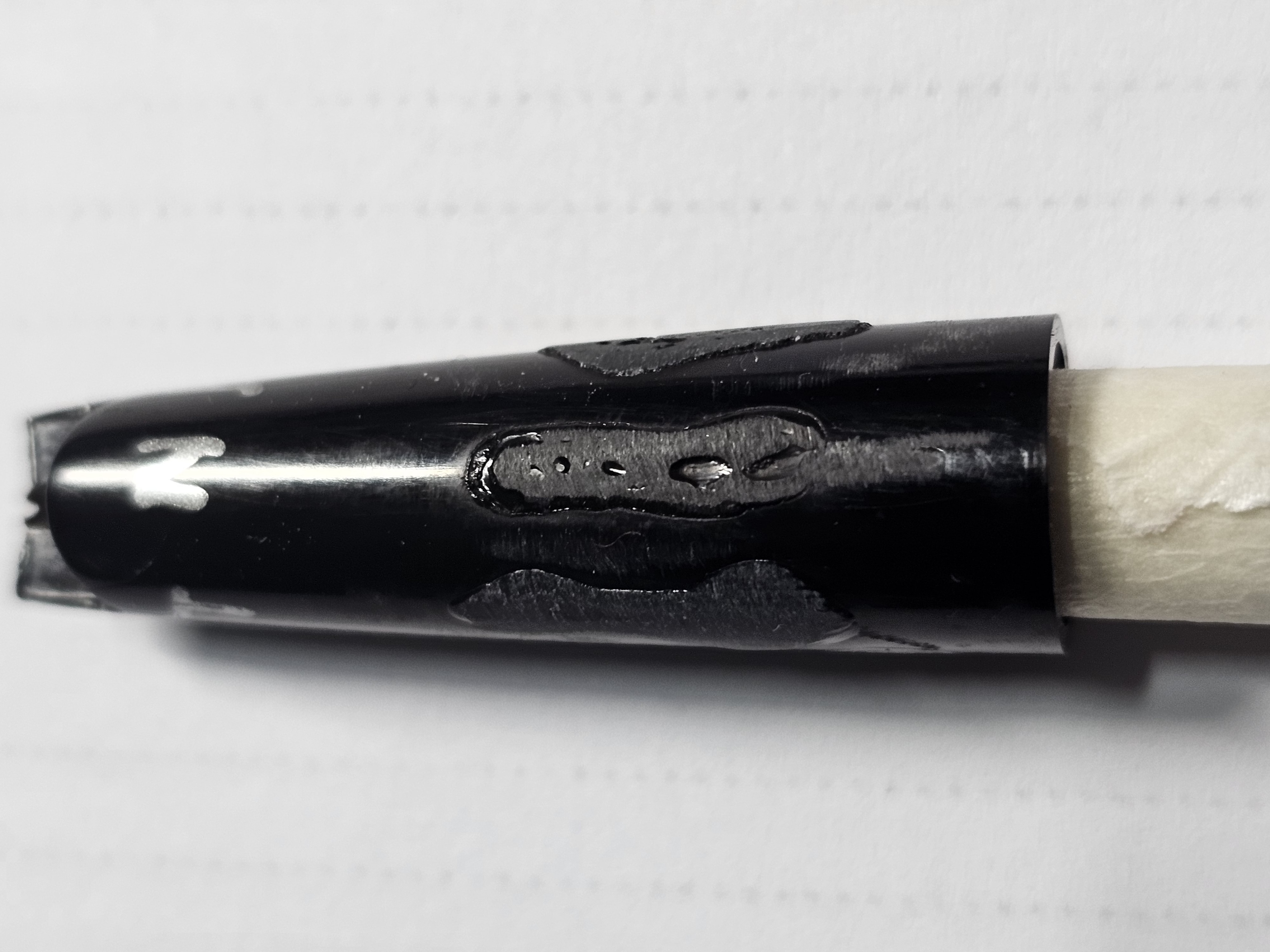 Nel caso specifico di resina nera Montblanc, il cianoaclilato nero da risultati finali migliori, il contro è che il ricalo del materiale è sensibilmente supeiore rispetto al trasparente; questo può comportare disomogeneità e necessità di diverse applicazioni.