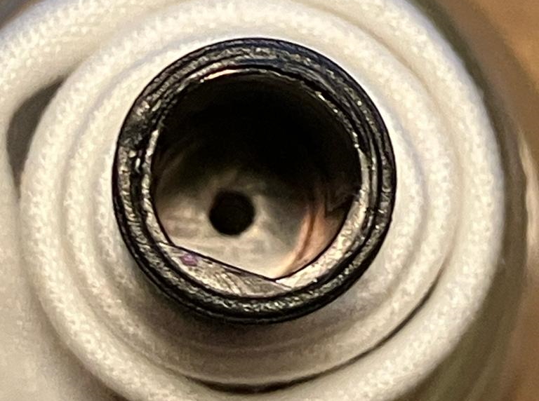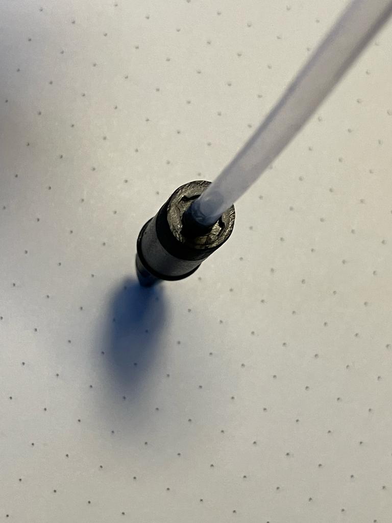 E questo è quello che ho fatto, ho preso il trapano con la punta più sottile che avevo (1 mm) e ho forato il fondo del converter, in corrispondenza del canale dell'inchiostro (Il collare Stipula ha una posizione interna obbligata per l'alimentatore, perché la sezione non è circolare ma ha una rientranza a "corda di circonferenza" che prosegue lungo tutta la lunghezza interna del collare. Ho quindi forato il collare diametralmente all'opposto della rientranza, in modo che la parte "alta" del converter con il canale dell'inchiostro sia in corrispondenza del foro).
