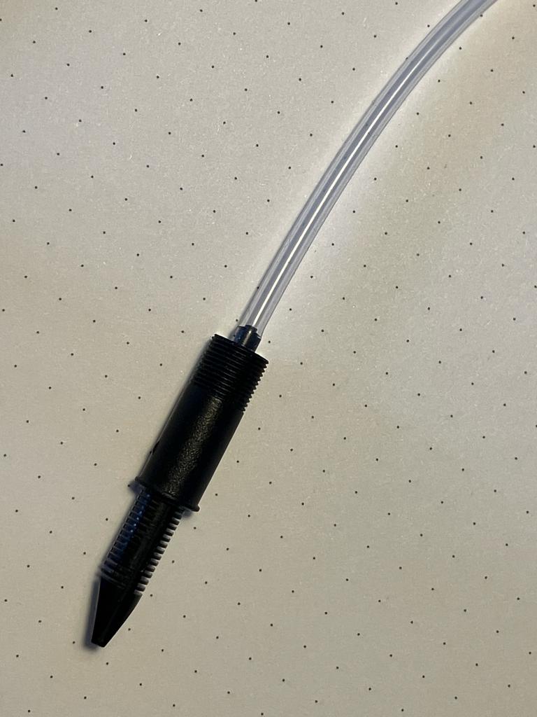 qui è ancora senza il foro A questo punto, mi sono procurato un tubicino in silicone, di diametro interno pari al diametro esterno del peduncolo del collare (2 mm), l'ho tagliato della misura che pressoché arrivi in fondo al serbatoio (ma che non entri nella pompetta), e l'ho montato sul collare. A questo punto ho provato a montare il collare sulla penna, e a riempirla.