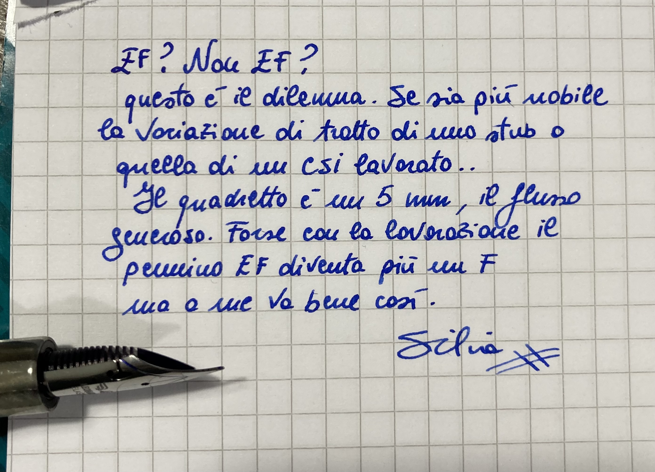 [..] perché francamente gli EF Pelikan, li ritengo, a voler esser generoso, dei medi un po' più magri. Se gli EF in questione son quelli, beh allora si, il senso si capisce un po' di più.