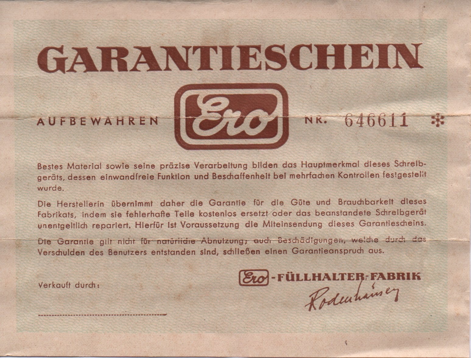 Vorrei dare anch'io il mio contributo in quanto possessore di una ERO (credo sia 407 il modello). La mia è completa di scatoletta e brochure/garanzia in tedesco. Credo risalga agli anni '70 (per via del pennino, vedi sotto) molto carina la targhetta del prezzo: 1200 Lire