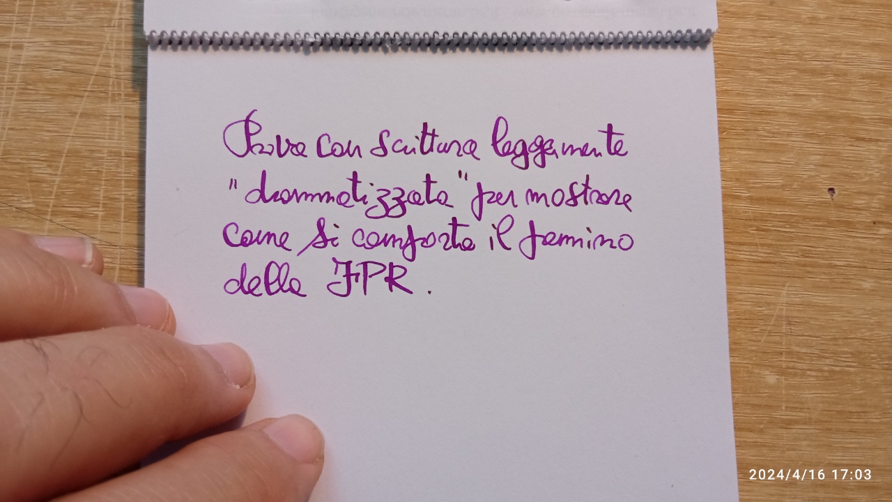 Con il pennino FPR #5.5 i tratti grassi sono ottenuti senza dover dissodare il foglio, cioè con una pressione del tutto naturale. Un ottimo risultato nella progettazione del pennino. Tiene bene anche il fine. Inoltre scorre benissimo.