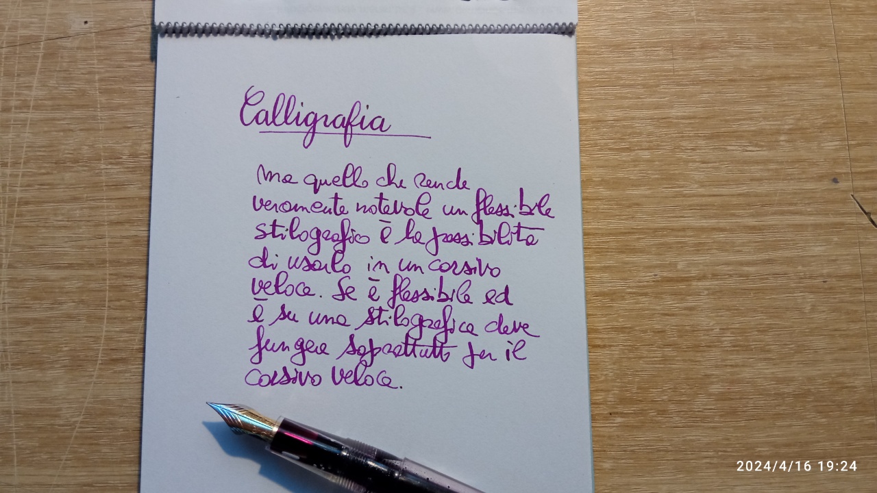 Nell'esempio che allego cerco di scimmiottare lo stile copperplate scrivendo la parola 'Calligrafia' con la Muft FPR (30 euro). Per farlo devo scrivere lentamente come un bimbo alle elementari. Nulla a che vedere con il corsivo ordinario di una stilografica. Ma il flessibile trova una sua valorizzazione anche nel corsivo ordinario che segue. Sempre che piaccia questa varietà di tratti pieni e magri. A me non dispiace.