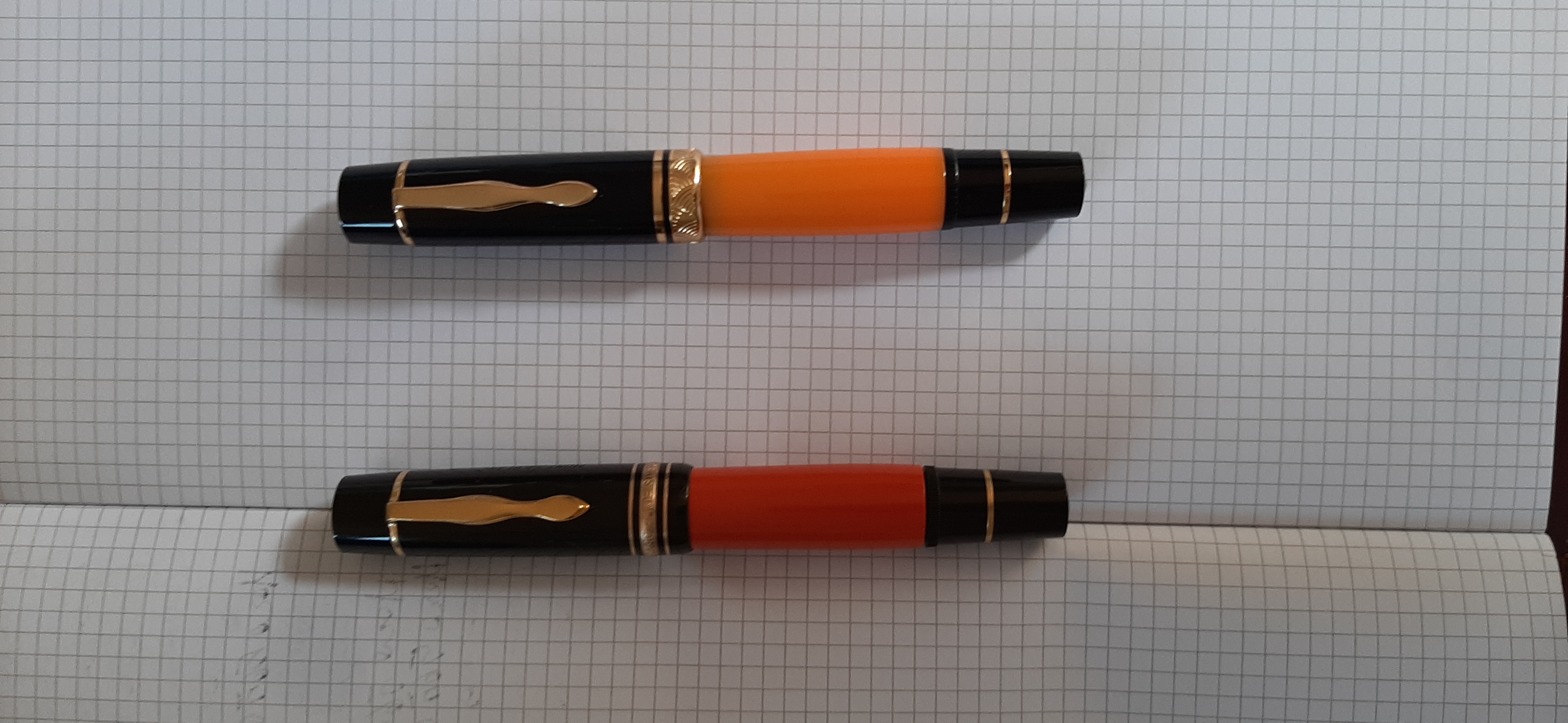 ps. parlando di cinesine ieri mi è stata consegnata ( con netto anticipo) la Majohn P 139 con pennino # 8 tratto M. Arrivata con scatolina molto carina (stanno alzando il tiro?). Al contrario del pennino " lungo coltello" # 6 dell'altra, che comunque dopo intervento di distanziamento dei rebbi ora scrive molto bene, questa ha scritto molto (molto) bene fin da subito ( scorrevole e morbido e infatti, come ogni stilo che si rispetti, scrive tranquillamente sotto il suo solo peso). Qui la vedete al fianco della sorellona ....e, pennino in oro a parte, a parte veretta finale del tappuccio che a mio avviso sarebbe stata preferibile se meno vistosa ( magari più ridotta o con finitura liscia), non crediate che sfiguri ( personalmente, avendo smontato il sistema pistone di un MB solitaire, ritengo molto probabile che quello della Majohn sia superiore)
