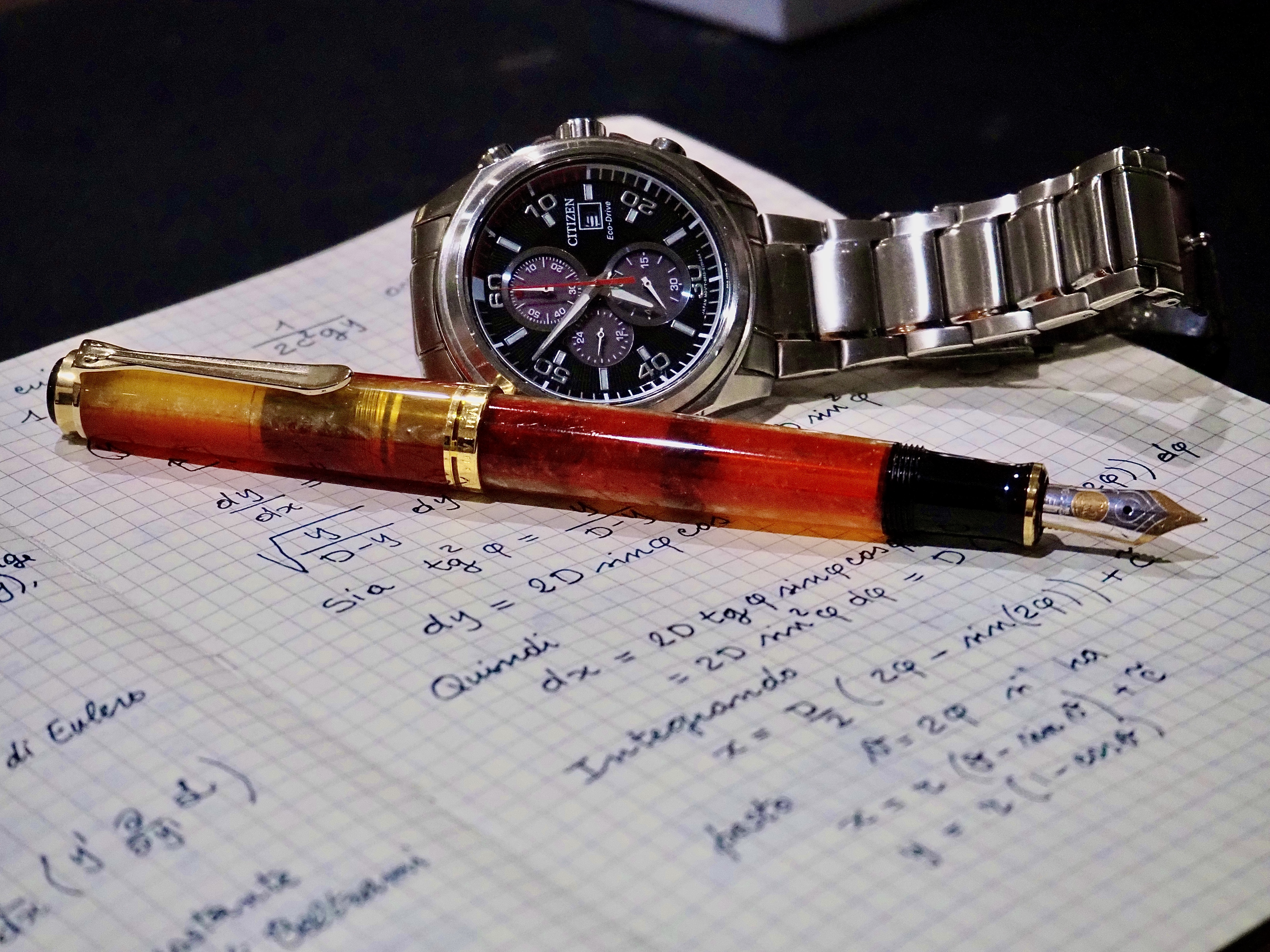 Ho messo a fuoco (con l’autofocus) la regione tra la penna ed il quadrante dell’orologio, la lunghezza focale non credo permettesse di fare di meglio. Avrei potuto diminuirla e poi ritagliare la foto ma avrei perso in risoluzione.