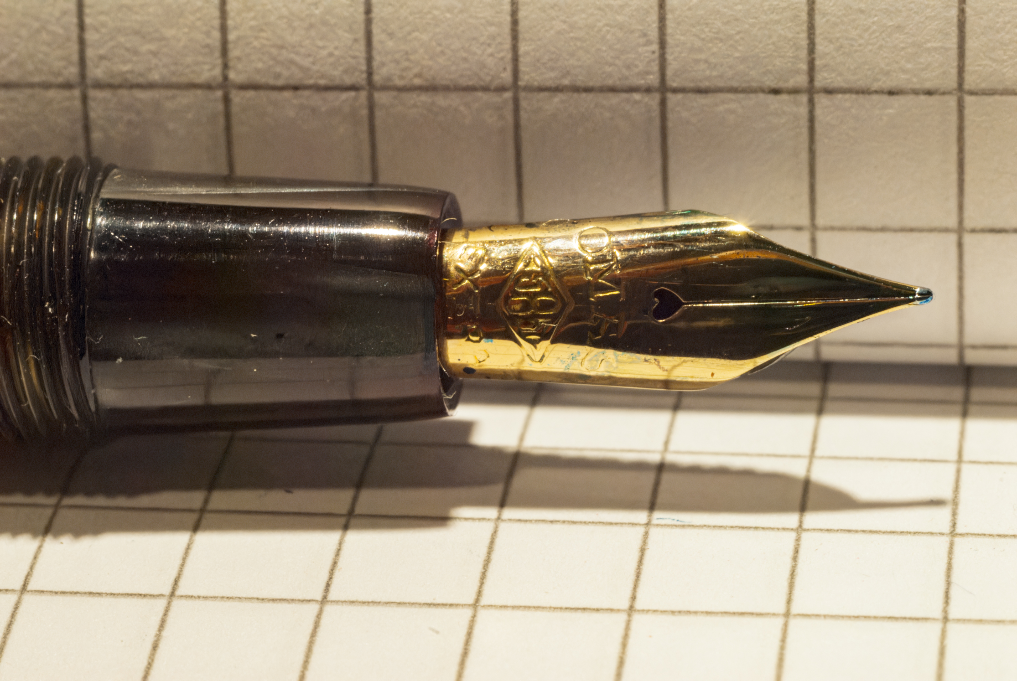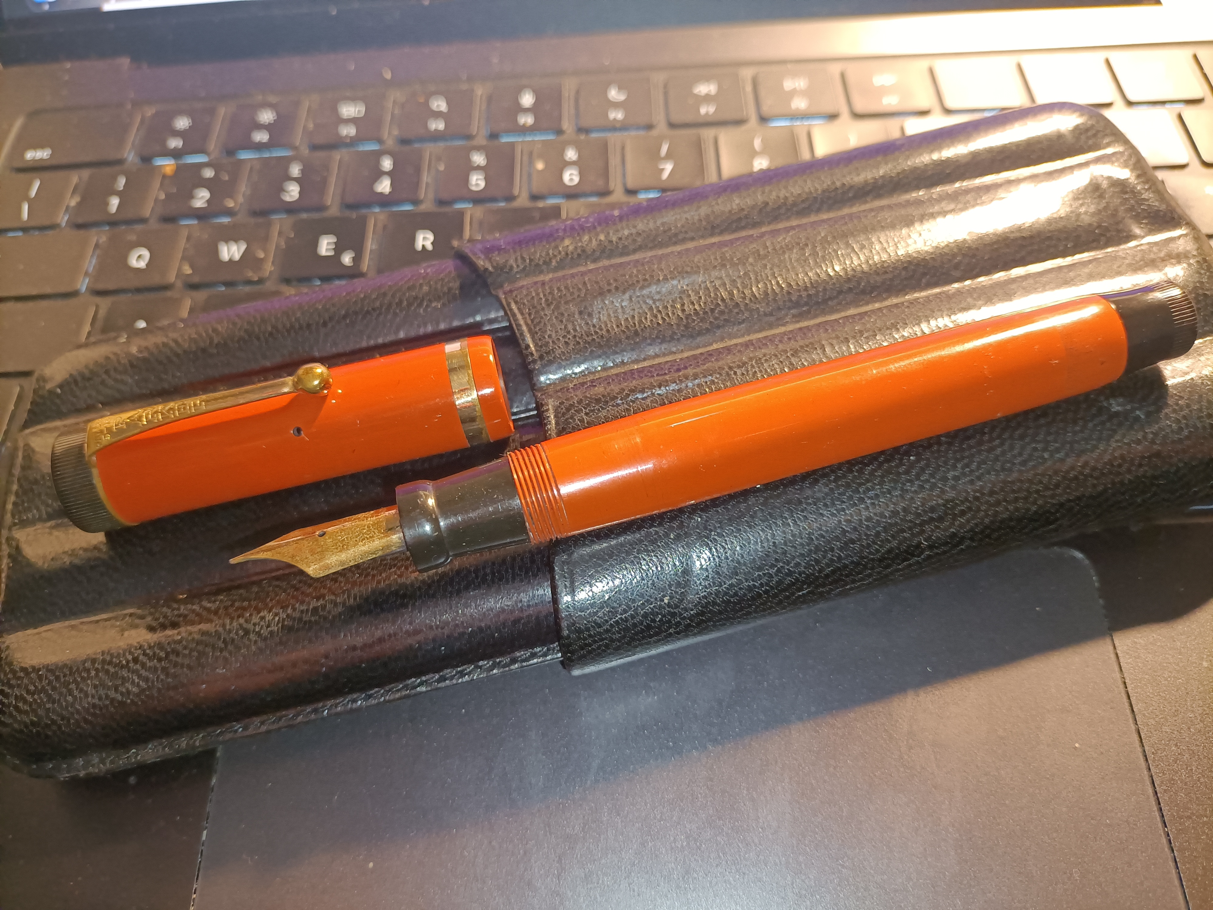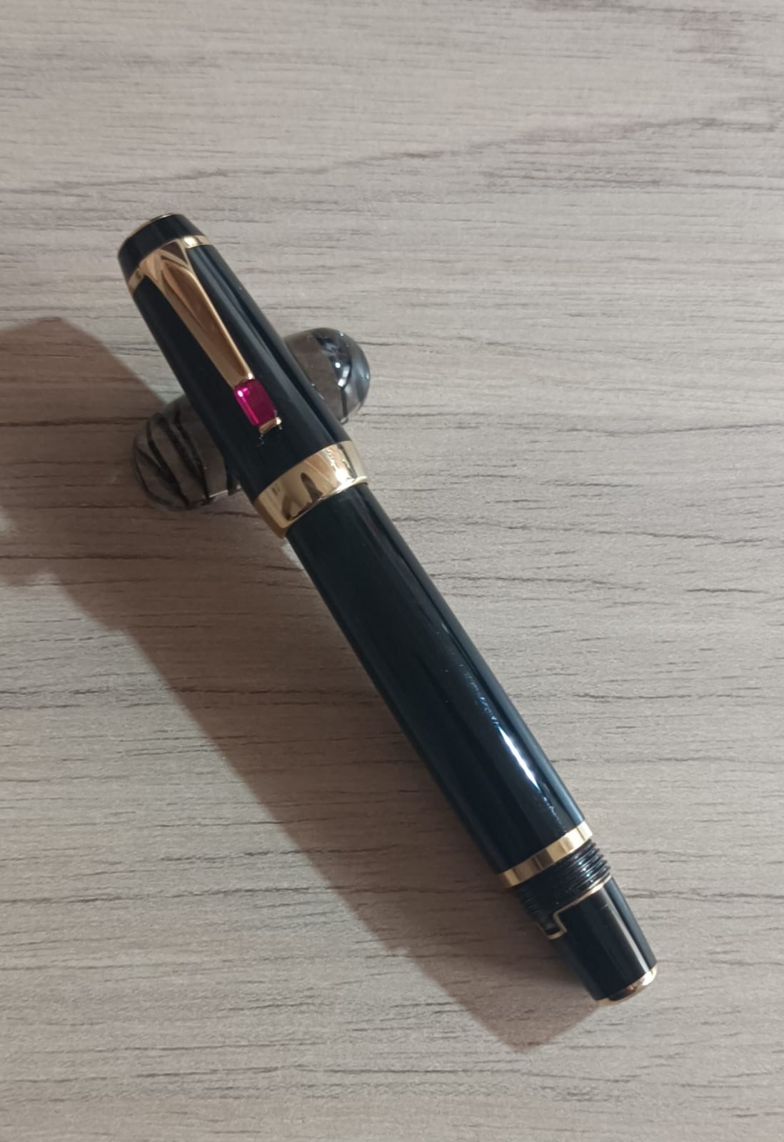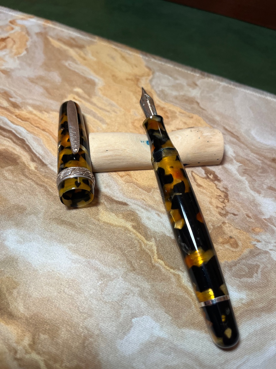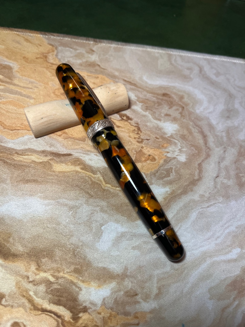 Ecco l’Etruria a stantuffo con pennino in oro 14k e minuteria in argento che arricchisce da ieri la mia raccolta. La penna è in resina ma sembra quasi una celluloide per quanto è bella.