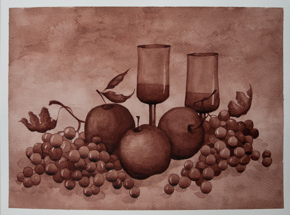 Riesumo l'argomento con un disegno, anzi un dipinto, perché la tecnica usata è del tutto simile all'acquerello, la sola differenza sta nel colore: l'inchiostro rosato al legno di pernambuco preparato qualche mese fa. Per realizzare la natura morta, l'ho diluito dapprima con una goccia di candeggina (che ne fa virare immediatamente il colore verso il seppia) e poi con acqua, secondo la necessità. Per il disegno ho utilizzato l'inchiostro stesso, diluito con poca acqua, e un pennino Gillott da disegno. Così, non avendo utilizzato la stilo, pur essendo un dipinto ad inchiostro, lo inserisco qui invece che nella Galleria del Circolo Artistico.