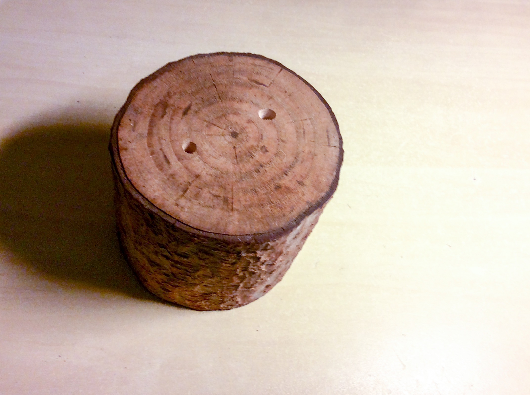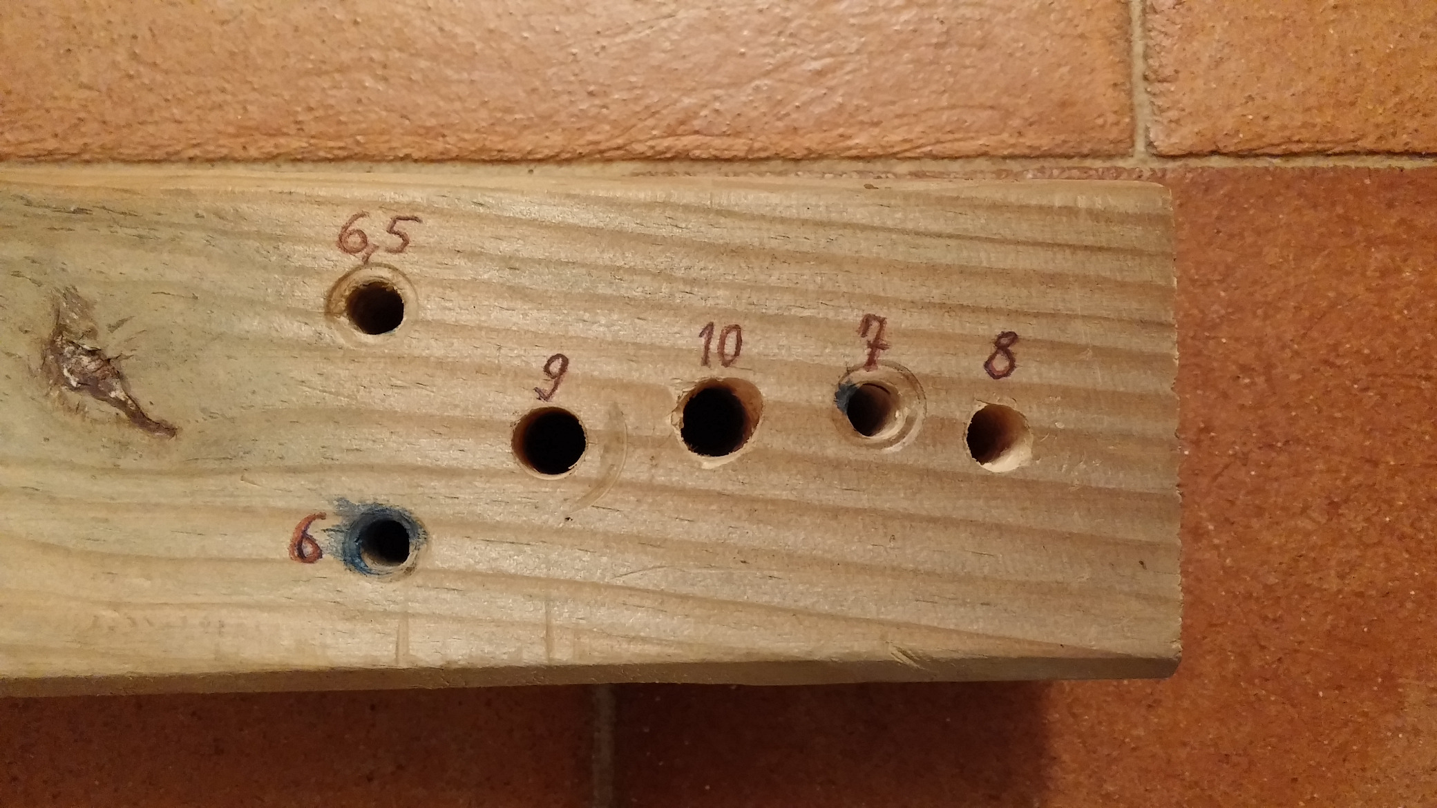 Il legno è spesso 4 o 5 cm. I fori dall'altro lato sono tutti allargati con la punta da 10 mm.