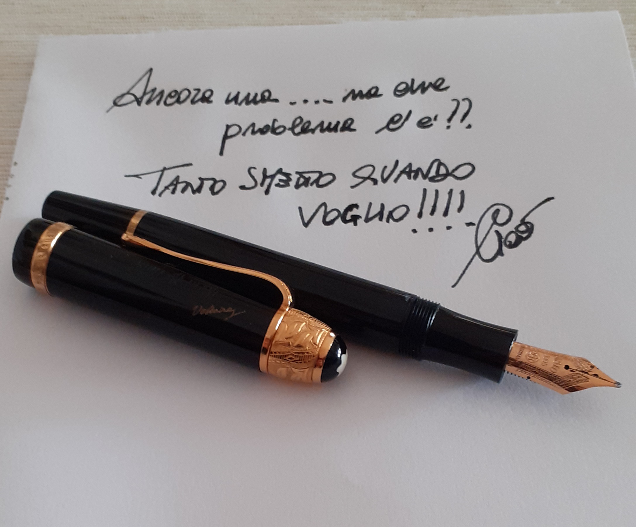 Quest'anno mi ero promesso di prendere solo 2 penne, e sapevo bene quali. Poi Sanpei ha messo in vendita una bellissima waterman's 52V e non ho saputo resistere... Così mi ritrovo tra le mani un gioiellino conservato splendidamente, dalle forme compatte e con un bellissimo pennino flessibile che sembra non sentire il peso degli anni!