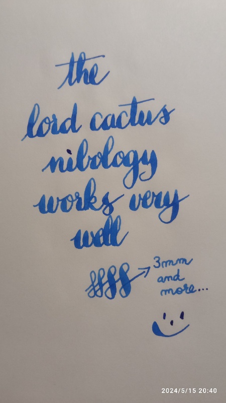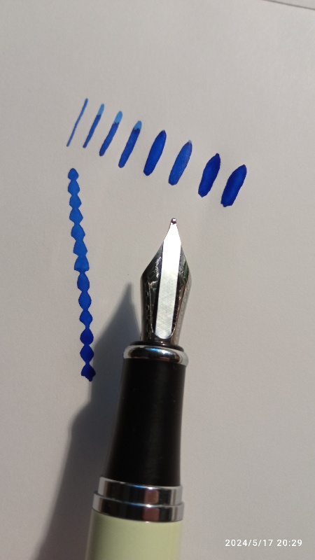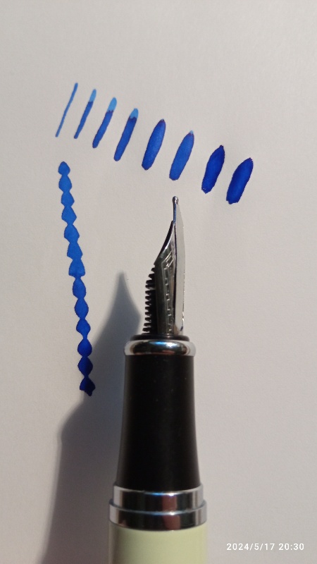 Il pennino ottenuto è di una flessibilità fantastica, si allarga senza problemi fino oltre i 2mm. Il taglio largo (ma non larghissimo) permette un flusso più abbondante, ma comunque controllato.