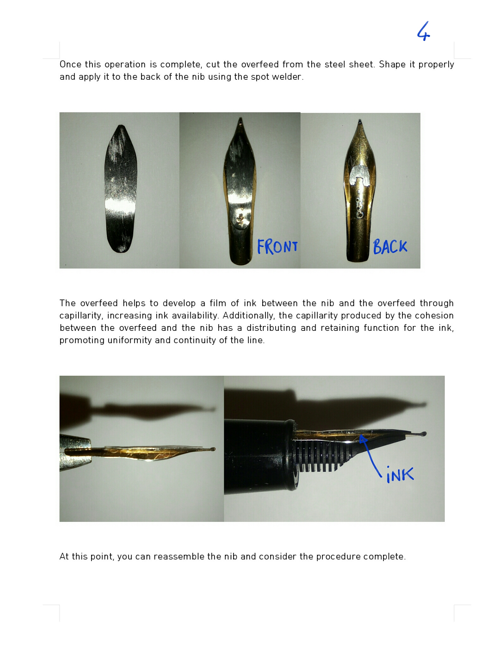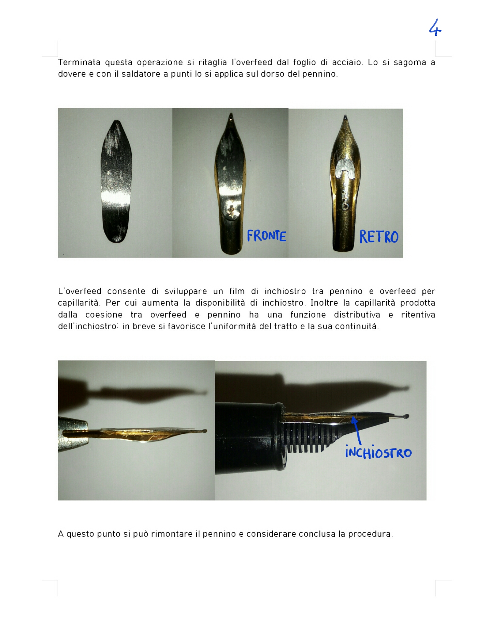 2) L'overfeed. È a mio avviso necessario. Soprattutto se si intende superare il millimetro e mezzo di variazione. Ha una funzione stabilizzatrice nel flusso di inchiostro. L'idea anche in questo caso la si deve a LordCactus. È lui ad avere mostrato con il suo pennino Arrowflex dove si può arrivare sfruttando questa tecnica. Io ho realizzato un Arrowflex e non posso che confermare quanto sia strepitoso come pennino. Devo dire però che è molto complicato l'accoppiamento pennino alimentatore. Il motivo è alquanto semplice: nell'Arrowflex l'overfeed è inserito alla base del pennino tra alimentatore e lato interno del pennino. Questo produce una minima alterazione dello spazio di coesione tra alimentatore e pennino che bisogna sapere gestire. Richiede tempo. Per il resto produce un'alterazione positiva (e di fatto è questa la vera e propria genialata di LordCactus) nella canalizzazione del flusso di inchiostro che inizia a propagarsi per capillarità tra overfeed e pennino a partire dalla base del pennino da cui fuoriesce. Per semplificare la complessità di questa vera e propria opera idraulica ho semplificato la messa in posa dell'overfeed. Semplicemente viene saldato sul dorso del pennino. Niente più problemi di accoppiamento con l'alimentatore. Di converso però viene meno la canalizzazione secondaria dell'inchiostro tipica dell'Arrowflex. Si instaura invece questa interessante dinamica: il pennino a riposo batte sull'alimentatore e l'inchiostro si propaga tra alimentatore e pennino e, visto che l'overfeed aderisce alla superficie del pennino, si propaga pure per capillarità tra pennino e overfeed. Quando il pennino flette cede l'inchiostro accumulato nel taglio del pennino e sotto l'overfeed. Quando il pennino cessa di essere sollecitato ritorna a pescare inchiostro dall'alimentatore e così pure l'overfeed in cui l'inchiostro non si propaga più a partire dalla base del pennino (come nell'Arrowflex) ma a partire dal taglio del pennino, cui aderisce. Per la scrittura questo sistema è più che sufficiente.