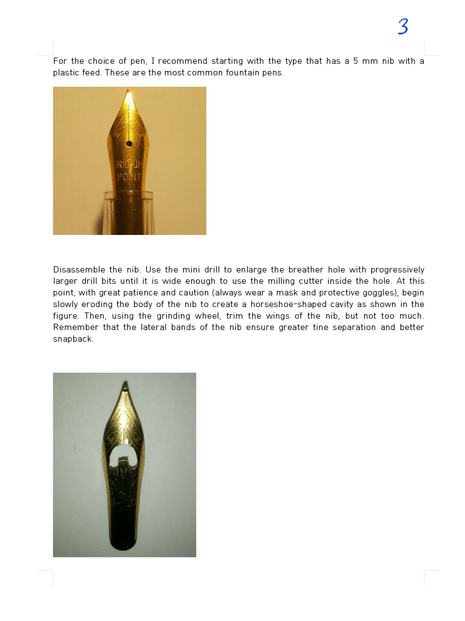 3) un pennino tagliato per aumentare la flessibilità. Il taglio è in una posizione che permette sotto pressione ai rebbi di aprirsi di più, e precisamente, come dicevo in un post precedente, agendo in un punto dove i rebbi si separano, per facilitarlo.