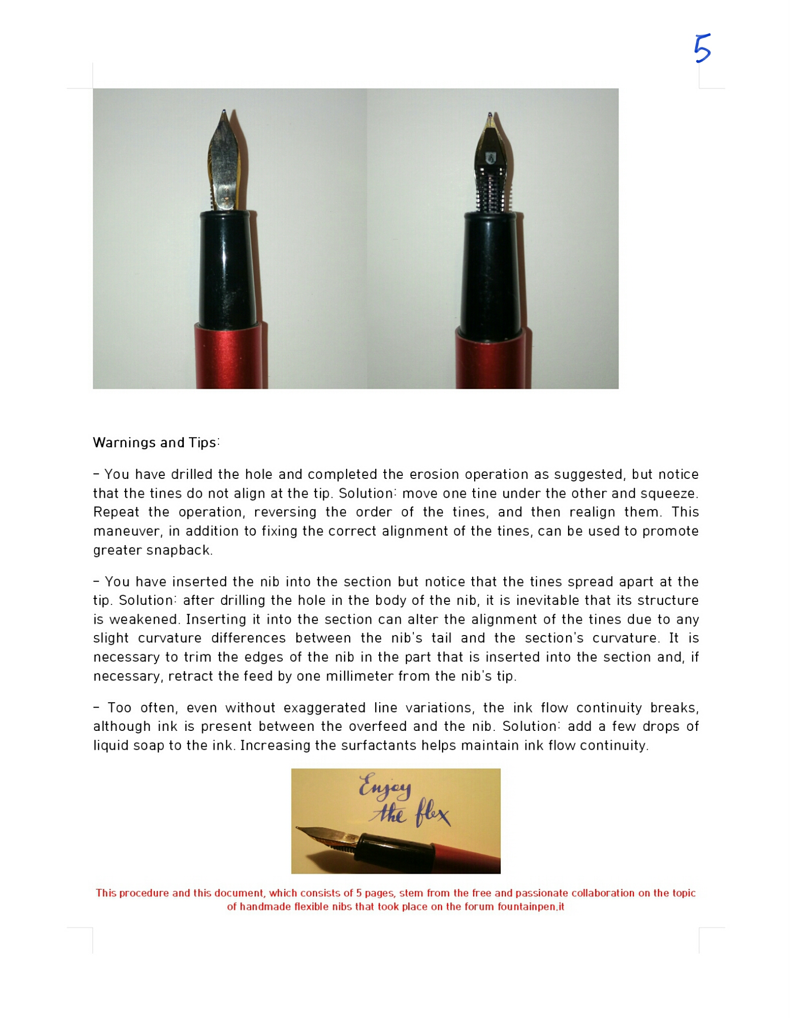 When it comes to flexible nibs in reviews and comments on specialized sites, one of the most frequent phenomena associated with these nibs is railroading. In the tests I have conducted to make a rigid nib flexible, this defect has never occurred; rather, the exact opposite has happened. The problem is the excess ink flow. Even on the FPN forum, those who enlarged the breather hole encountered the issue of too much ink flow. Erroneously, in my opinion, this phenomenon was attributed to a 'greater air intake' produced by the increased diameter of the breather hole. To be more precise: there is obviously greater air/ink exchange, but the cause does not lie in the increase of the breather hole diameter. The same phenomenon, in fact, also occurs in unmodified Indian flexible nibs (with a long slit). In this case, the phenomenon is just less noticeable because the line variation is minimal, but anyone who has used them, particularly size 6, has noticed the phenomenon.