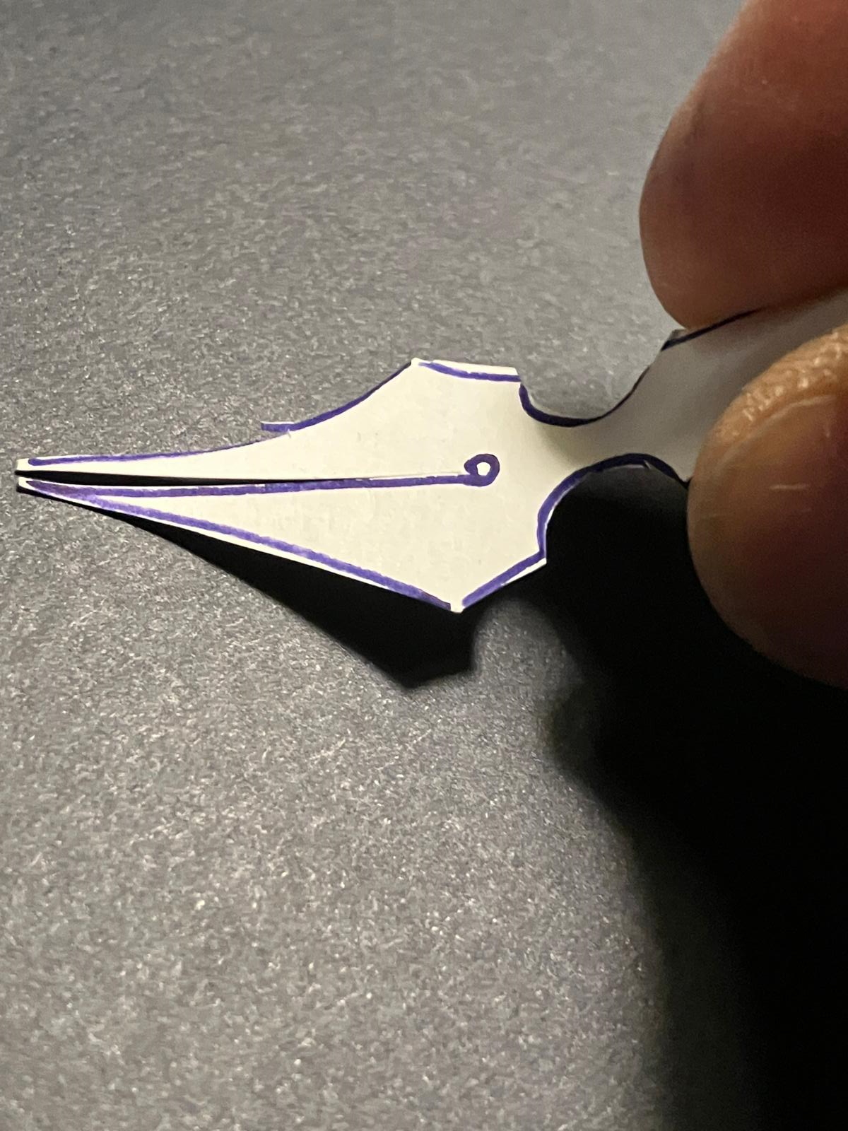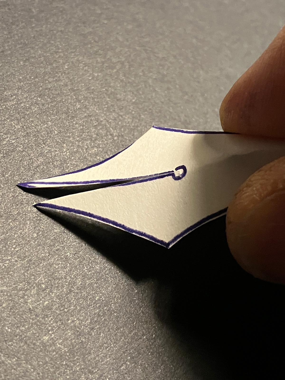 1) La forma del foro. Su questo punto abbiamo discusso sin dall'inizio. Il tema è stato molto dibattuto anche sul forum di FPN. La mia scelta per funzionalità e 'innovazione' è caduta su quanto suggerito da LordCactus. A mio avviso è questa la soluzione migliore. Cioè non praticare semplicemente il foro, ma lavorando di fresa eroderne il contorno lasciando che l'area interna del foro rimanga attaccata al pennino. Questa trovata consente di ottenere un massimo di flessibilità, minimizzando i rischi di crisi nella stabilità del flusso d'inchiostro. Alessio Pariani l'ha realizzata in maniera perfetta. Io utilizzando una micro fresa un po' meno ma la strada giusta secondo me è quella.