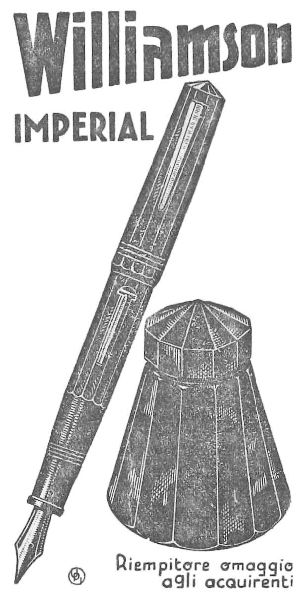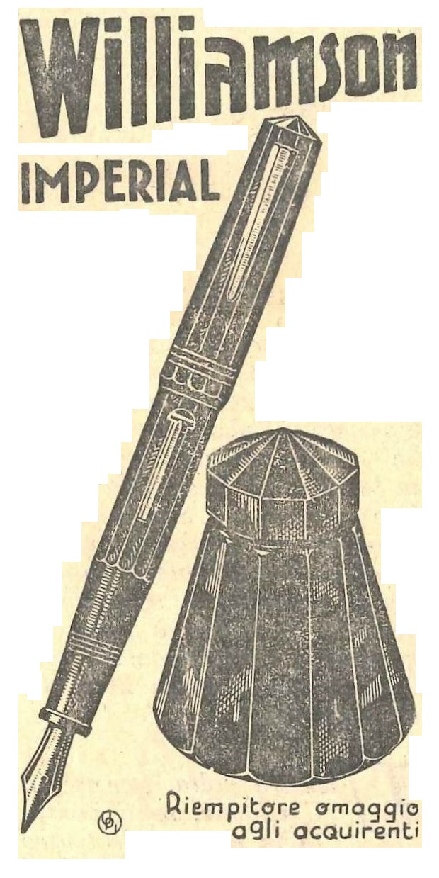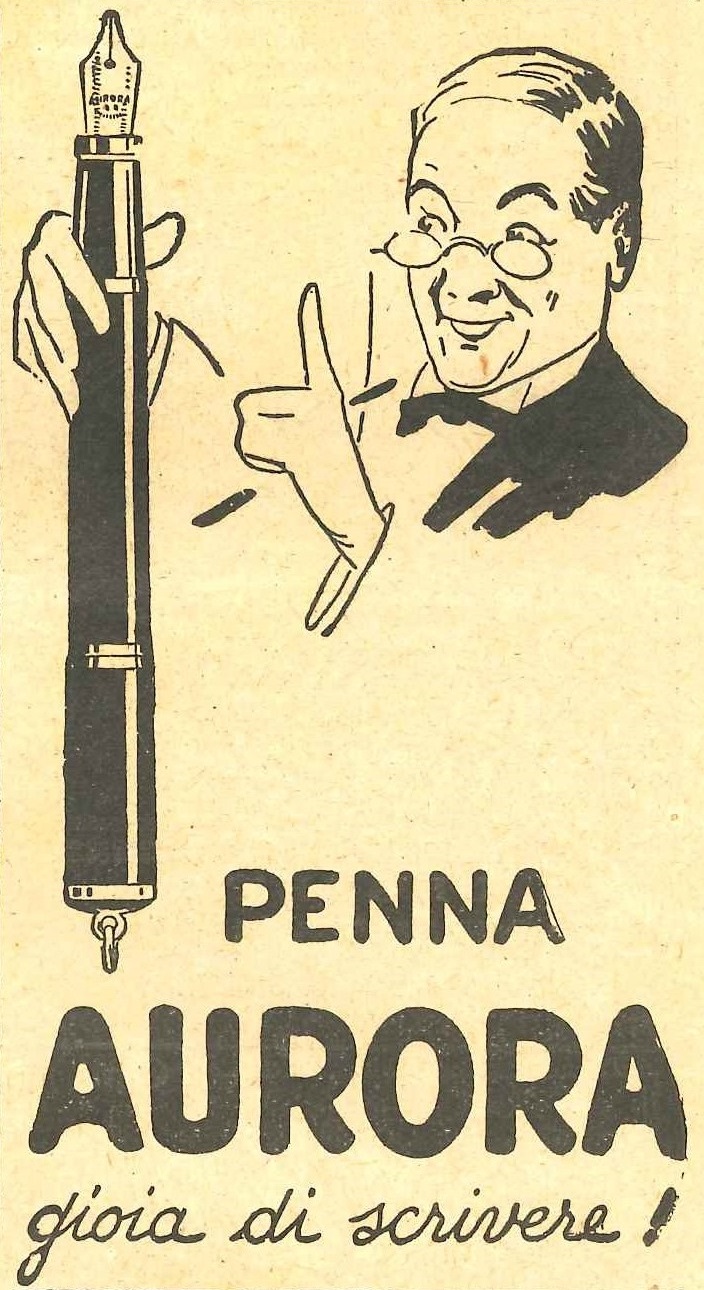 Terminata la gloriosa "era Biscaretti", caratterizzata oltre che dalle straordinarie illustrazioni anche dallo slogan "Penna Aurora / La penna che non imbratta le mani", la Ad in presentazione riprende un nuovo slogan "Aurora / gioia di scrivere!" che compare per la prima volta due anni prima, nel 1926 (sul Wiki, almeno).