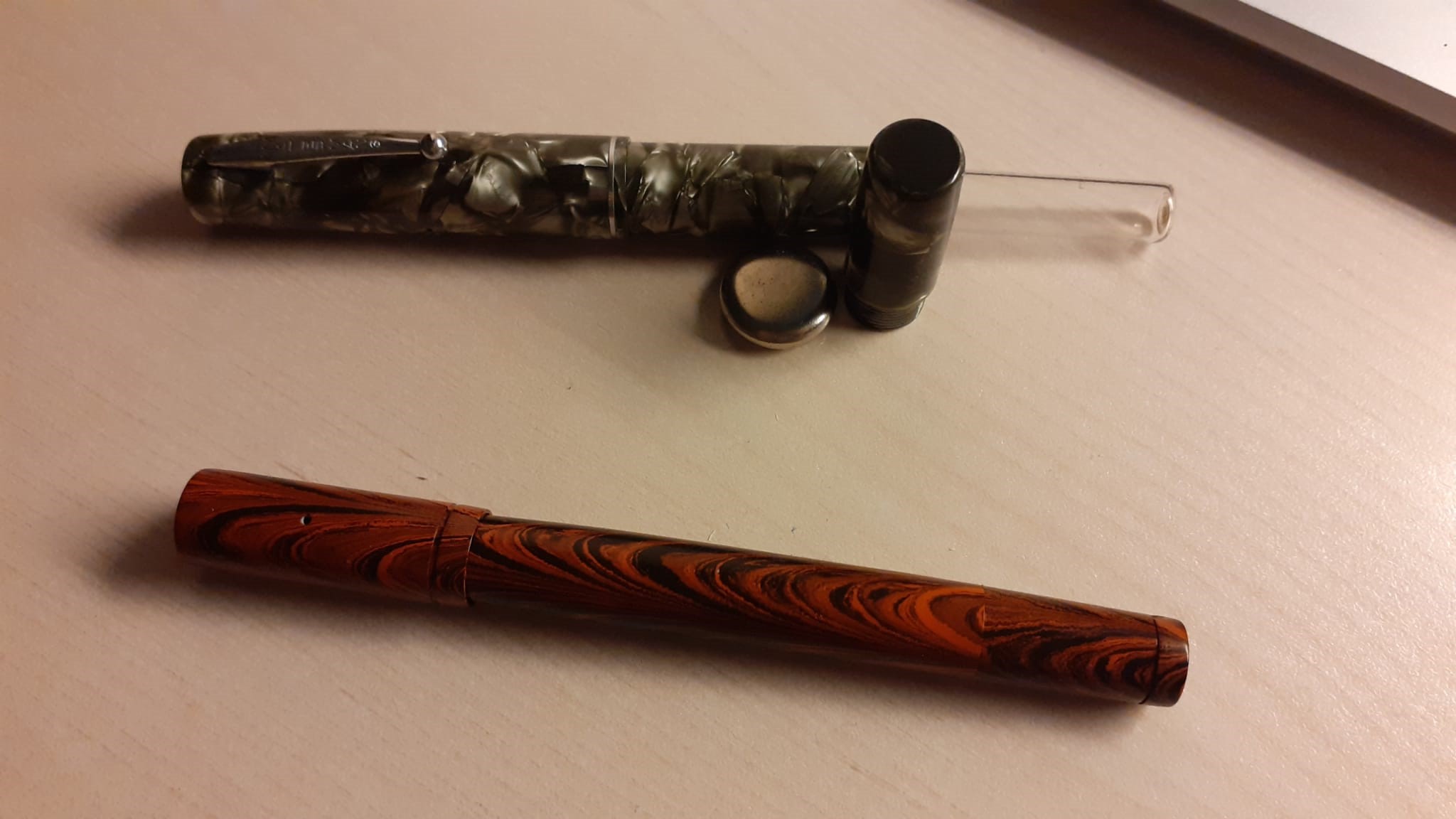- Waterman 42 1/2 arrivata semidistrutta ma in condizioni estetiche eccezionali. Crepa nella parte posteriore del fondello (ebanite riparata), spirale spaccata a metà (re-incollata anche lei) e guarnizione ovviamente da buttare(rifatta in gomma).