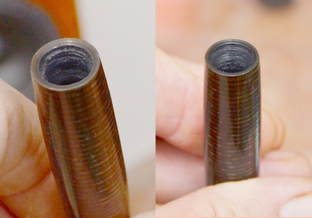 Ho levato con la punta di una graffetta piegata a 90° tutta la parte che rendeva la filettatura del fusto simile ad un cilindro con qualche filetto qua e qualche altro la, ho ripreso la filettatura, un po con l'attrezzo usato precedentemente, un po con il pezzo che doveva essere avvitato , un po col calore del fono e tanta, tanta pazienza.