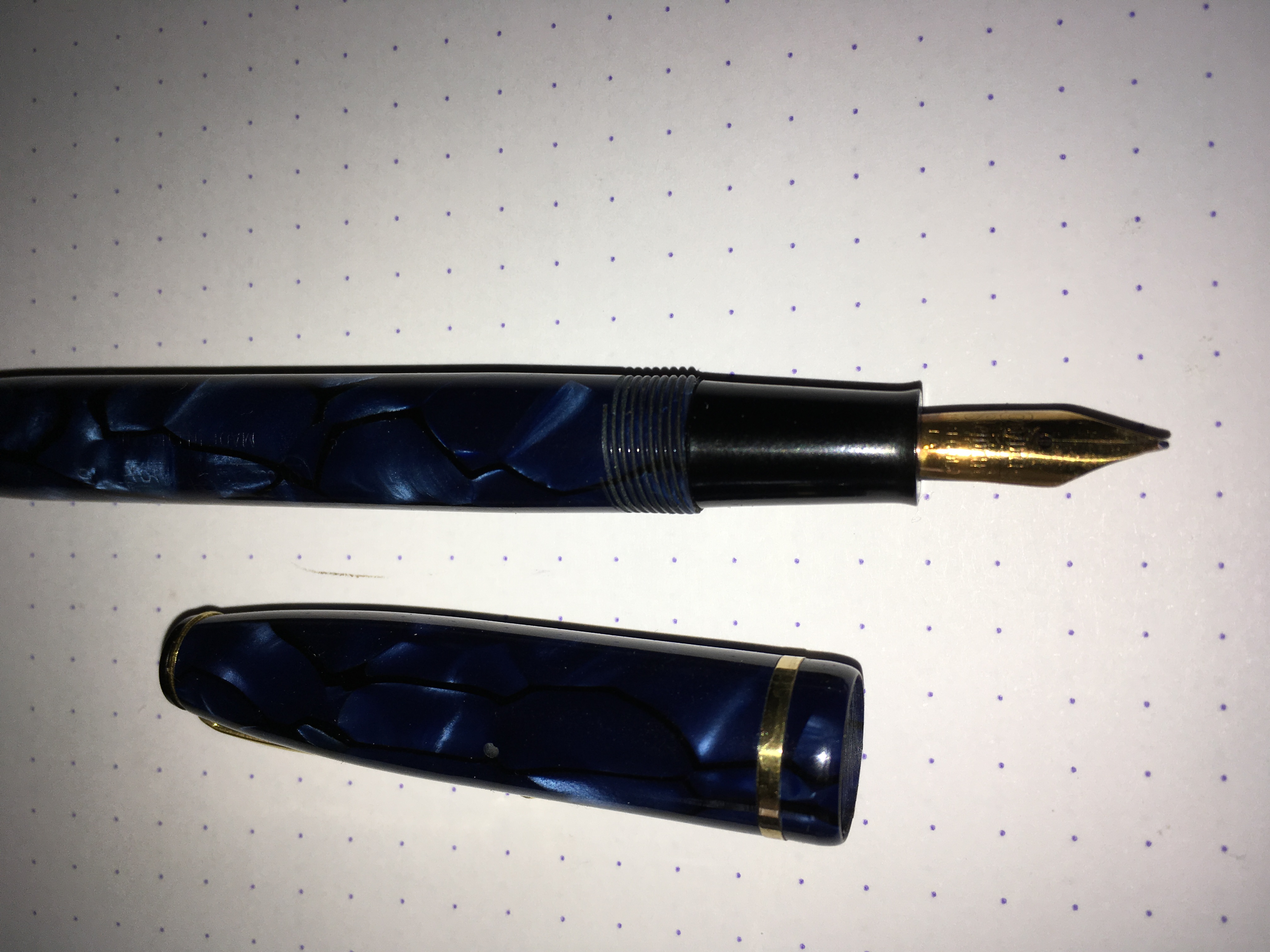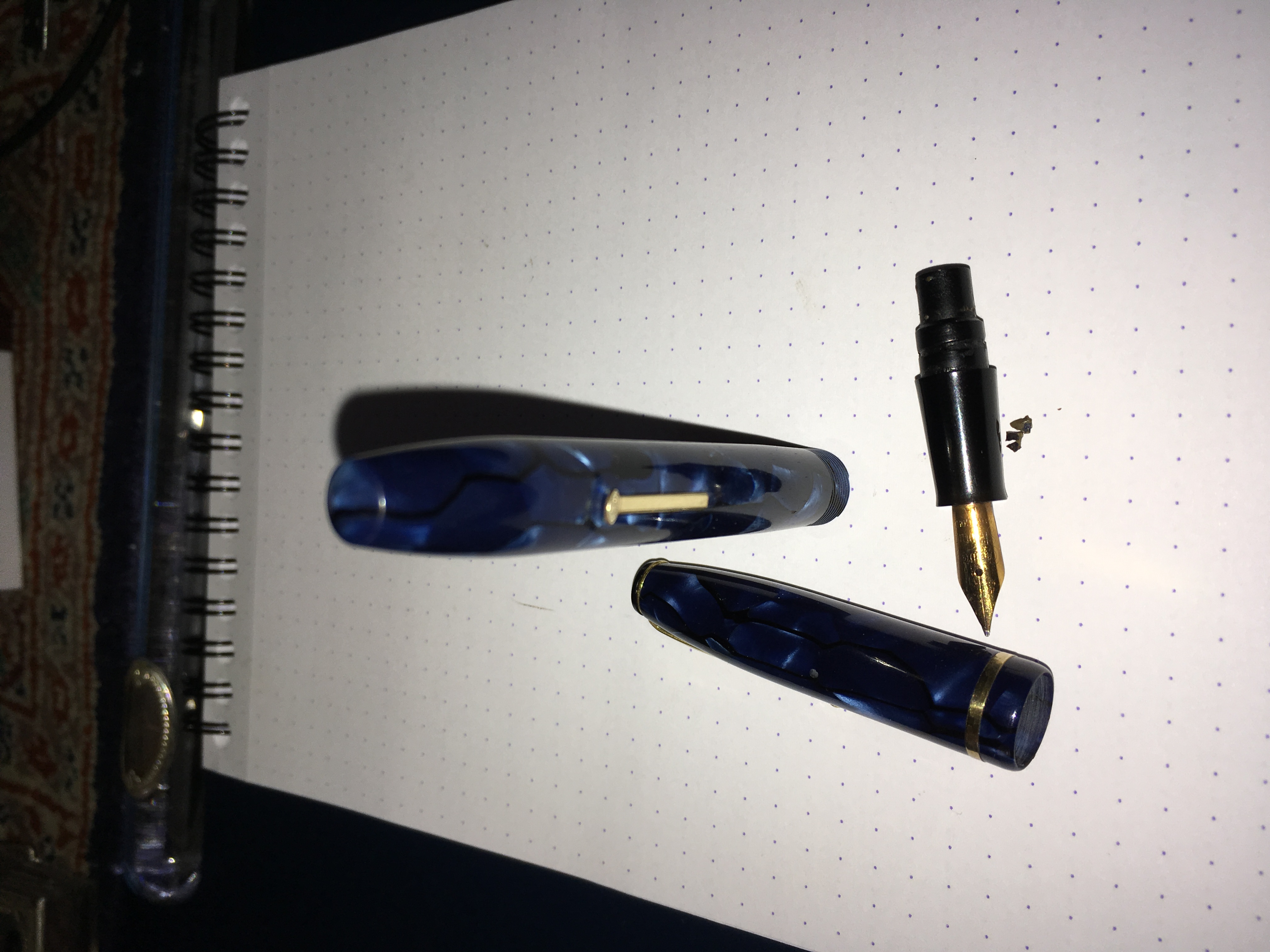 ecco la mia Conway Stewart 15. Del tutto cementata all'inizio, con un minimo spruzzo di Svitol sono riuscito a staccare il corpo pennino ottenendo una cascata di briciole di materiale brunastro che, immagino, fosse appartenente al sacchetto Convay originale. Ho provveduto alla ripulitura del barrel e poi del pennino dove ho dovuto procedere delicatamente con la punta di un taglierino, sperando di non far danni. Una pulitura generale finale e, nelle foto, i risultati. Nel frattempo sono in attesa del nuovo sacchetto: nella fretta di procedere fidandomi delle mie misure ho acquistato un sacchetto da 16.5; il suggerimento di ThePendragons consigliava una misura 18 ma purtroppo il messaggio era finito fra gli indesiderati!. Vedremo se dovrò procedere ad un secondo acquisto.