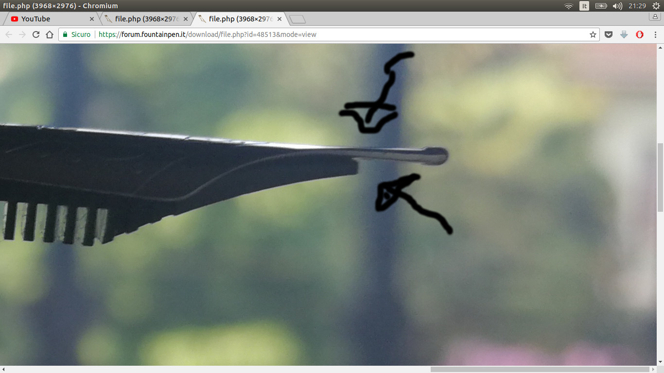 L'alternativa più semplice per mettere a contatto alimentatore con rebbi è quello di immergerli inSiberia ha scritto: ↑martedì 24 luglio 2018, 21:45 Il difetto mi sembra chiaro: come indicato dalle frecce, la punta dell'alimentatore non combacia bene con il pennino. Bisogna portare avanti le punte, una alla volta. Devi stringere, tra indice e pollice, l'alimentatore, con l'altro dito spingere in avanti un rebbo e poi l'altro.