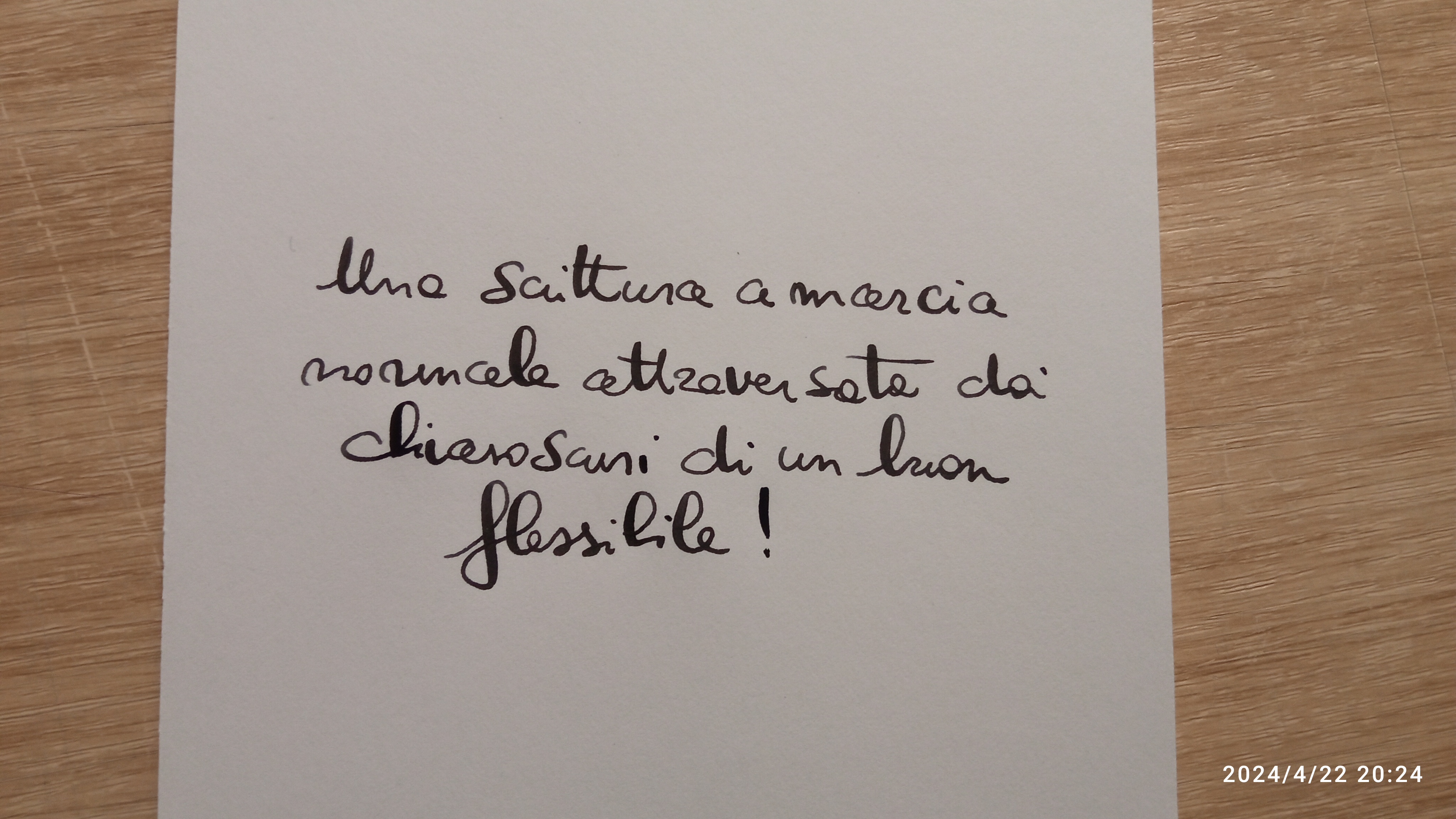 Pertanto io non riesco a flettere rapidamente, neanche con zebra G. Ma può darsi che altri riescano. Per quanto riguarda la scrittura normale, penso che potresti tirare qualche linea flessa con una pressione moderata. Ma tu riesci a scrivere veloce mentre fletti su e giù? Io no. La scrittura flessibile pare sia più lenta. Non vedo nessuno fare calligrafia velocemente, alla fine è un lavoro di precisione.