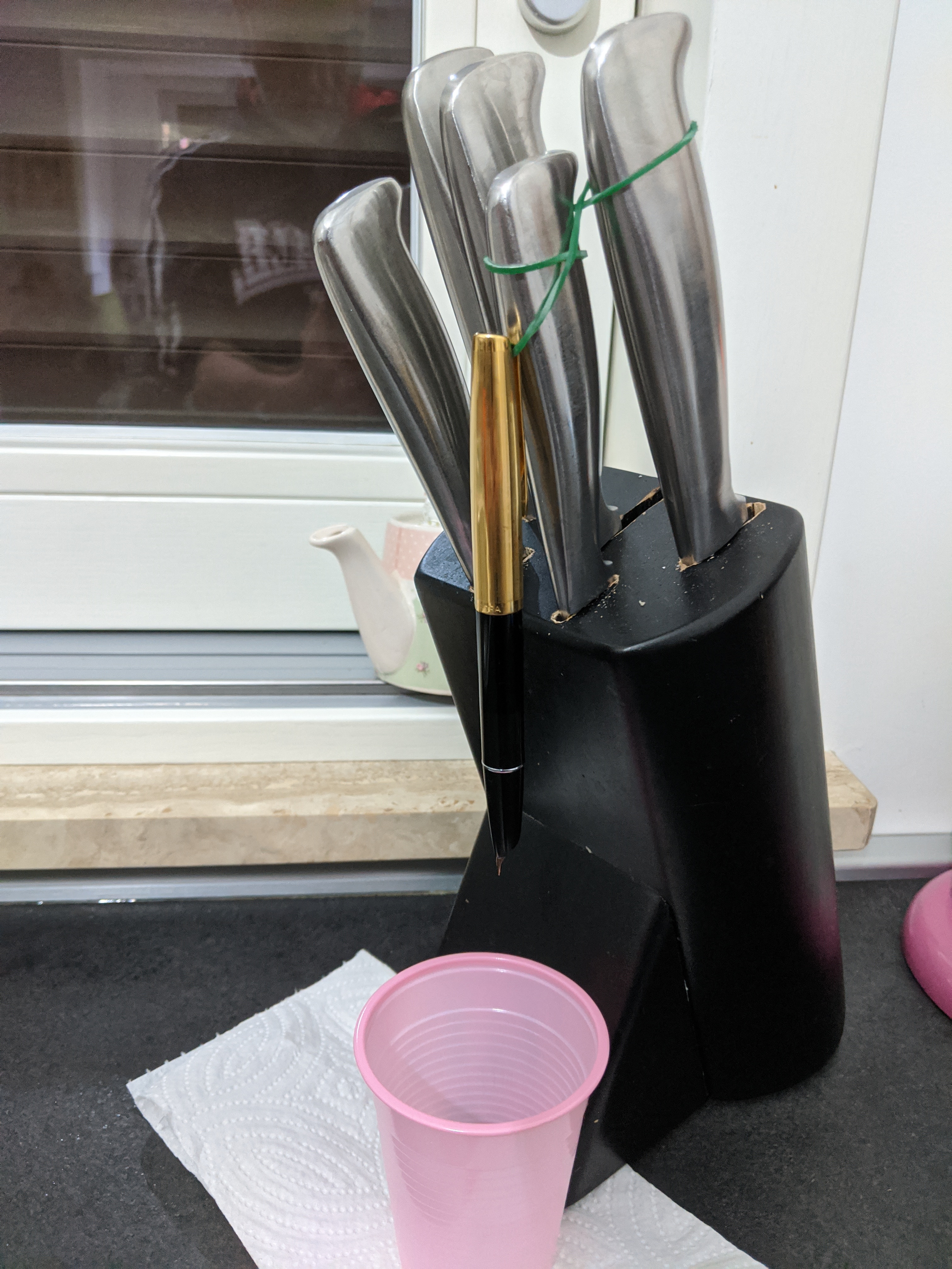 Io la ficco senza complimenti a pennino giù nel bicchiere, ma penso vada bene anche così. Temo però che se le guarnizioni trafilano pochissimo, da questa prova potresti anche non accorgertene. La prova della soffiatina l'hai fatta?