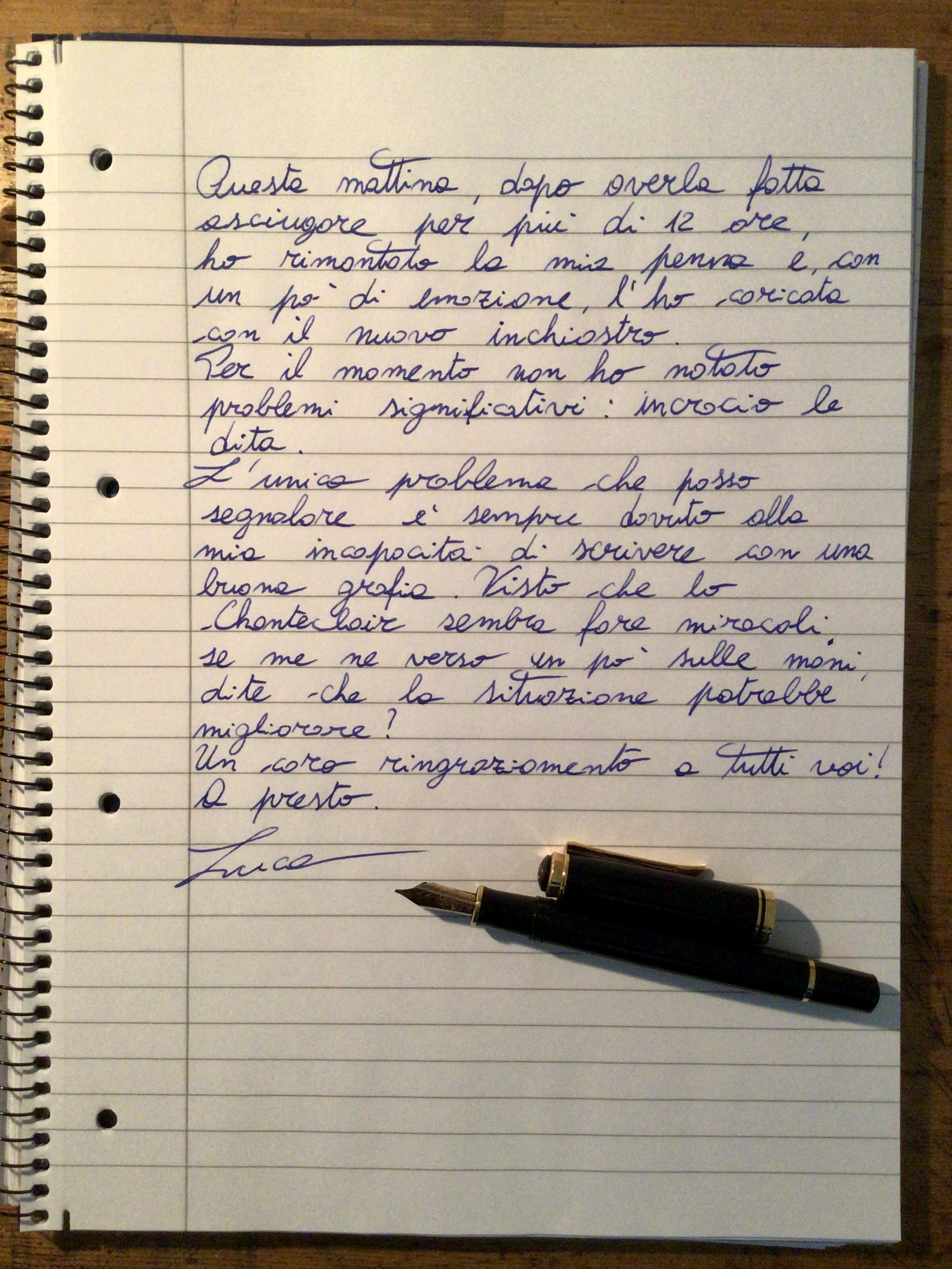 Stamani ho rimontato la penna e con un po’ di emozione ho provato ad usarla. La situazione sembrerebbe ottimale. Per il momento non ho avuto nessun problema di skipping. Ora sono molto più tranquillo. Naturalmente seguirò anche il vostro consiglio di utilizzarla il più possibile prima di fasciarmi la testa. Mentre la stavo usando mi è venuto un dubbio: quando ho finito di usarla, se penso di usarla nelle prossime ore o il giorno dopo, mi sembra di aver capito che posso lasciarla carica ma in che posizione? Orizzontale, verticale pennino in su o verticale pennino in giù? Grazie mille davvero! Vedo che i miei argomenti (thread) da principiante imbranato sono sempre molto seguiti e per questo non finirò mai di ringraziarvi.