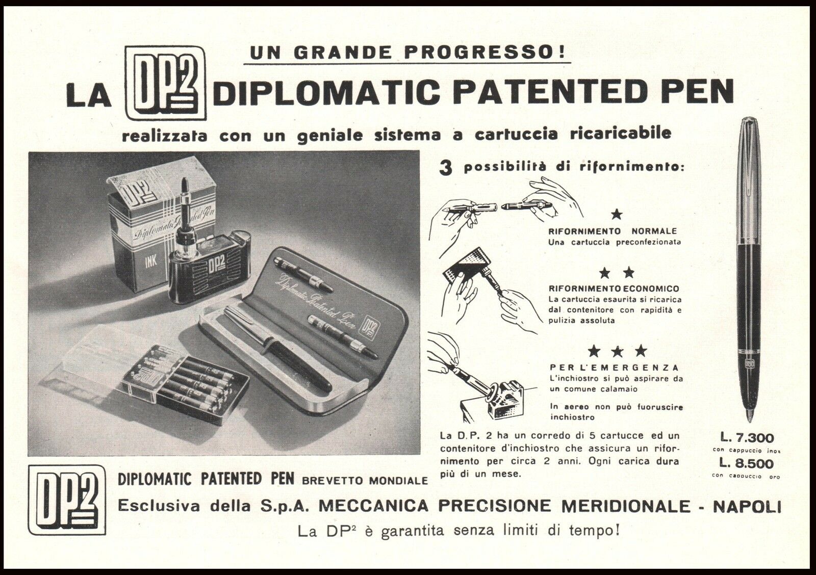 Mi pare che nel citare i precedenti dell'idea della cartuccia ricaricabile a pompetta, sia stato tralasciato quello più calzante, ovvero quello dalla partenopea Diplomatic Patented Pen 2, maglio nota come DP2. A questa penna, nata negli anni '50, il successo non arrise e durò ben poco sul mercato, ma aveva delle vere e proprie cartucce dotate di gommino per essere ricaricate. Gli esemplari ancora in giro non sono purtroppo più utilizzabili, salvo pesanti modifiche, perché la gomma della pompetta e dell'attacco sulla penna è irrimediabilmente seccata.