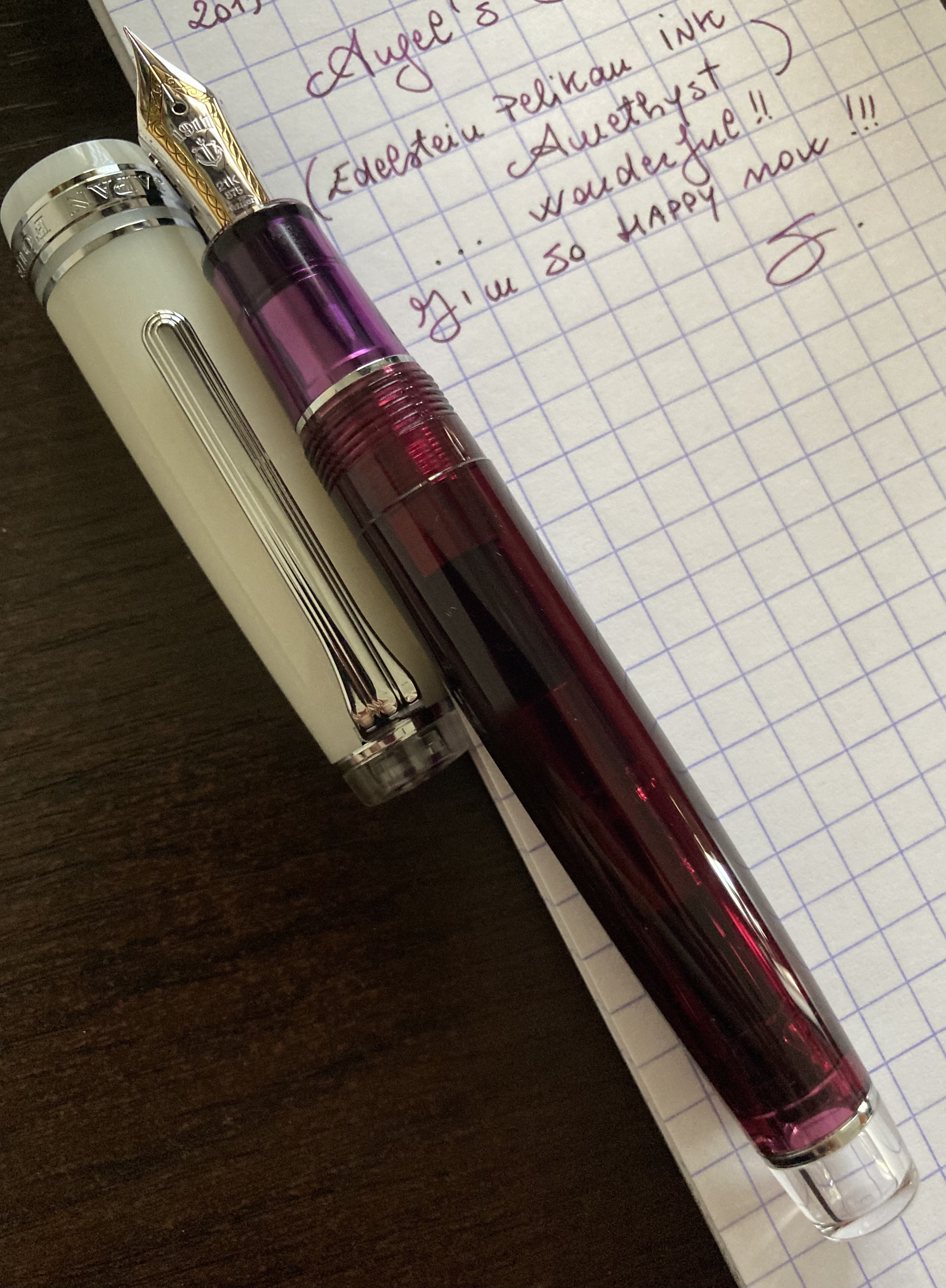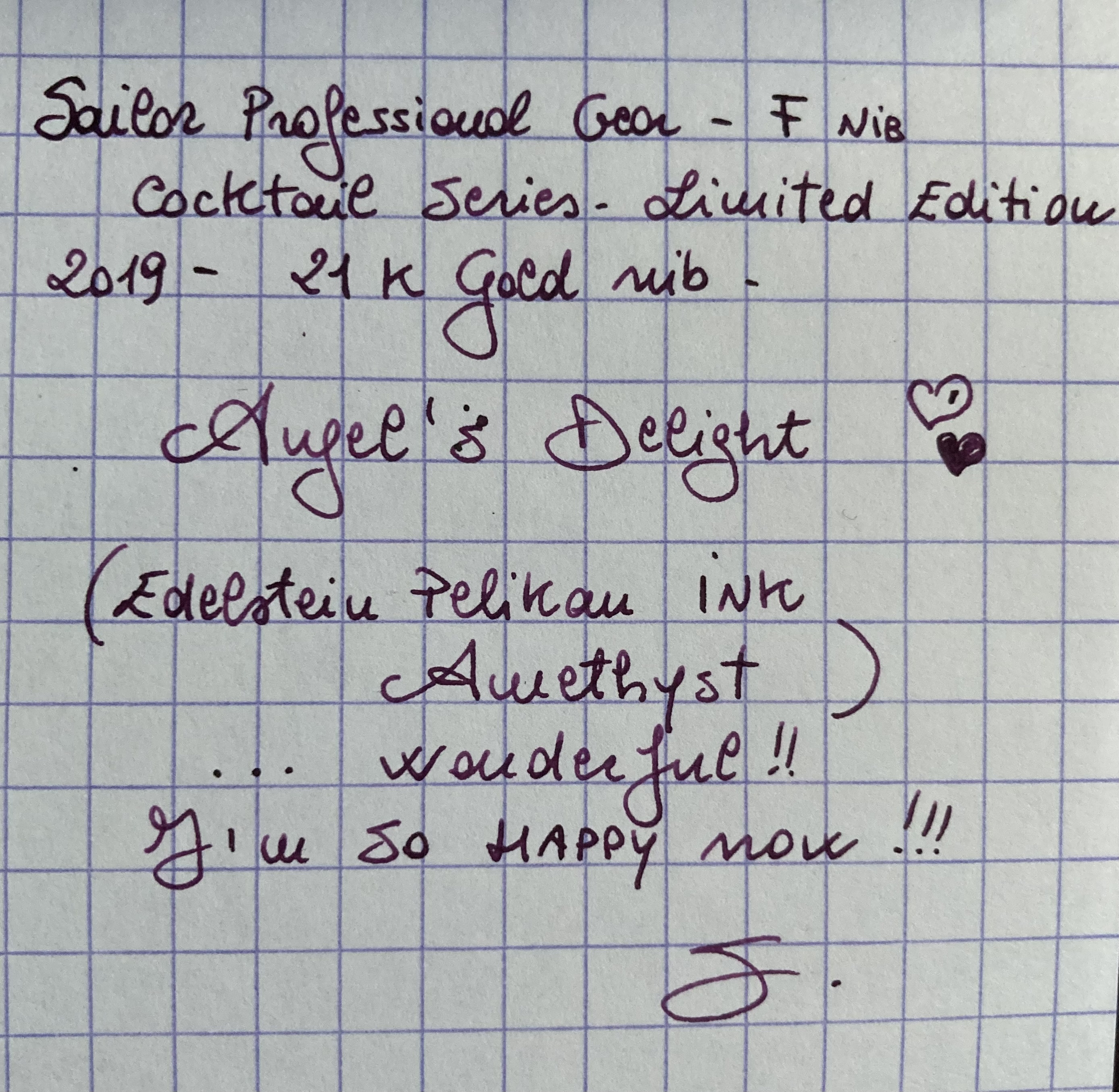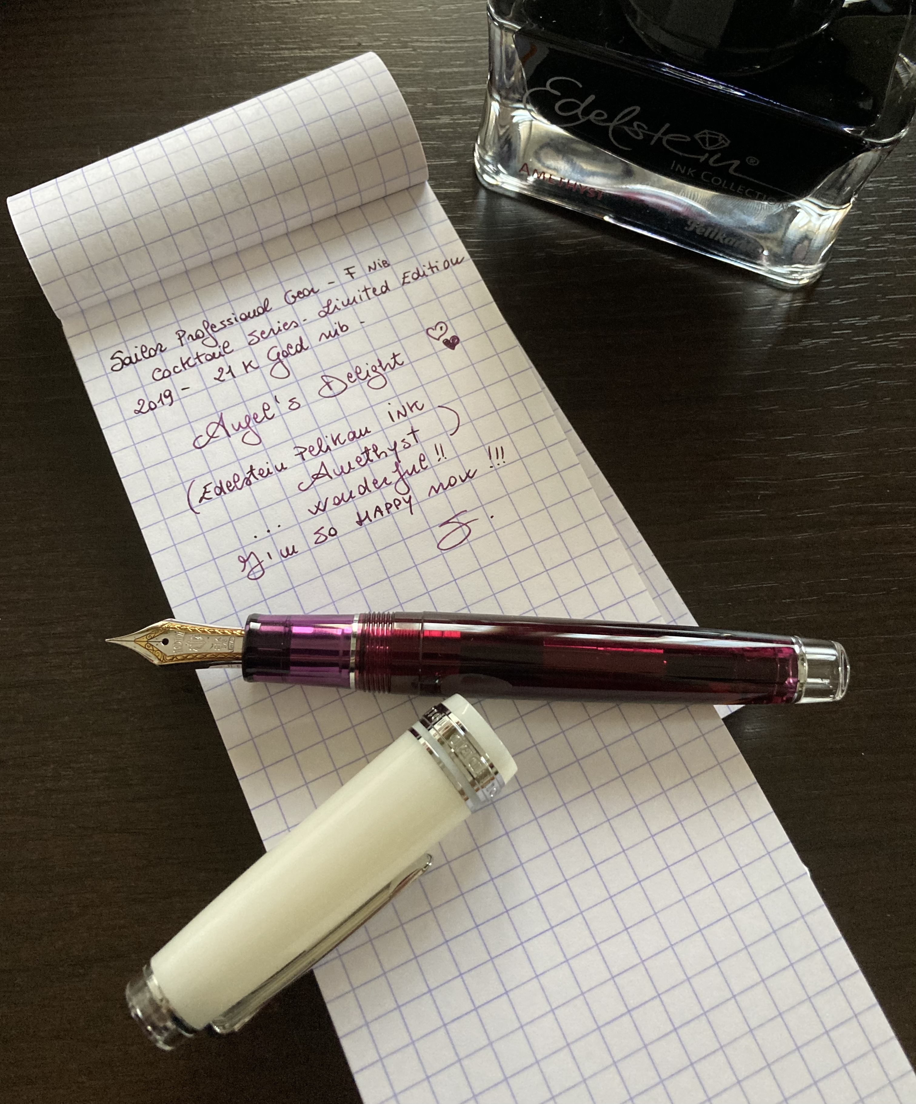 Ho deciso e scritto al venditore che non essendo ancora arrivata la Pro Gear avorio di cambio, chiedo di avere la Angel’s Delight, punta F. Che bello poterla abbinare agli inchiostri viola, porpora e ametista!
