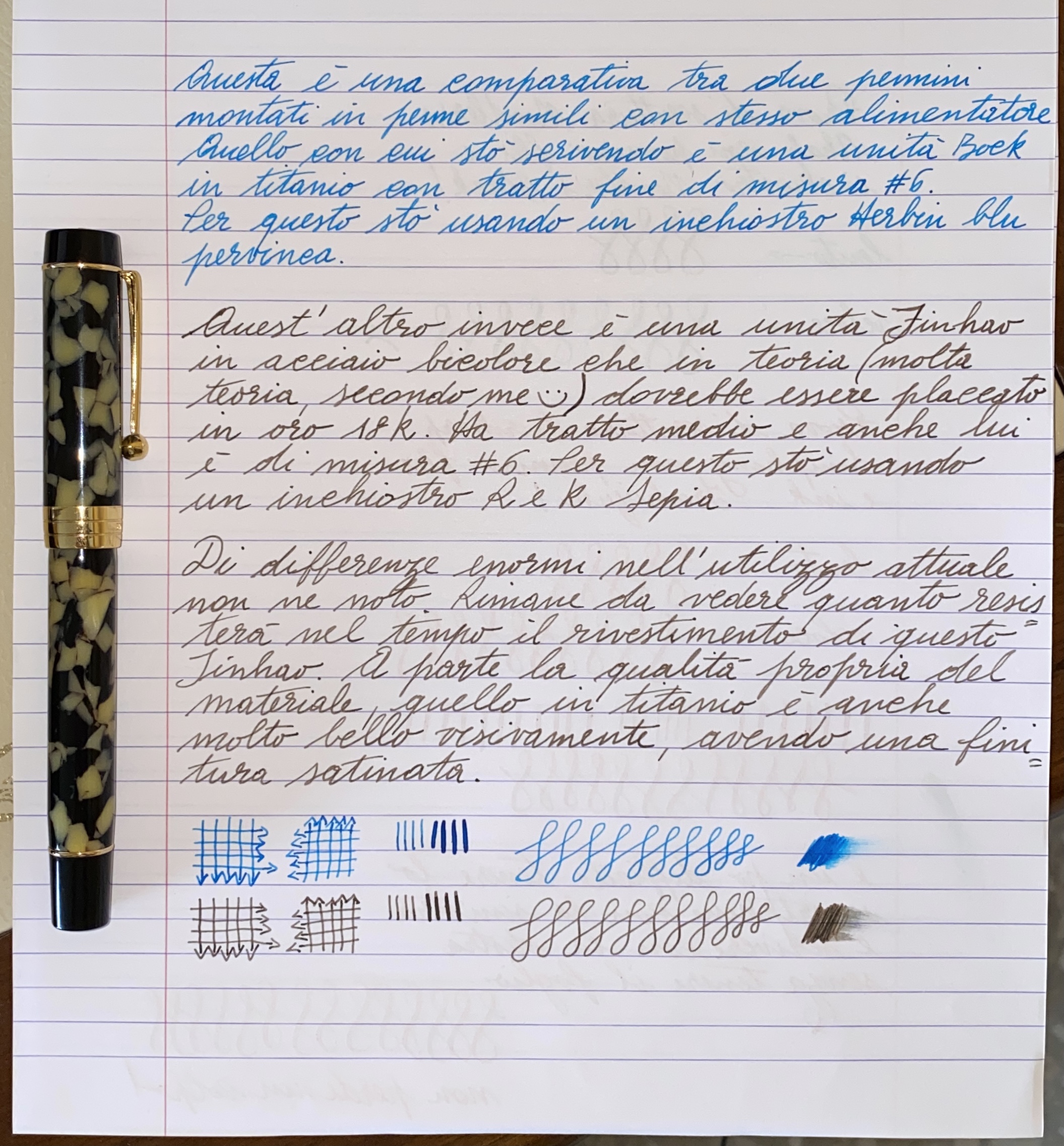 Ciao, questa è una comparativa senza pretese tra due pennini montati in penne simili con stesso alimentatore. Quello con inchiostro blu pervinca è il Bock in titanio F mentre quello con inchiostro Seppia è l’originale Jinhao in acciaio bicolore che in teoria sarebbe placcato oro 18k. Nell’uso normale non trovo quasi differenza se non nel feedback un pochino più accentuato nel Bock, che comunque è di tratto più sottile e oltretutto l’inchiostro Herbin non è rinomato per la sua lubrificazione. Con questo confronto non intendo dimostrare alcunché, verosimilmente è l’ennesima scusa per giocare con le nostre amate. :wave: