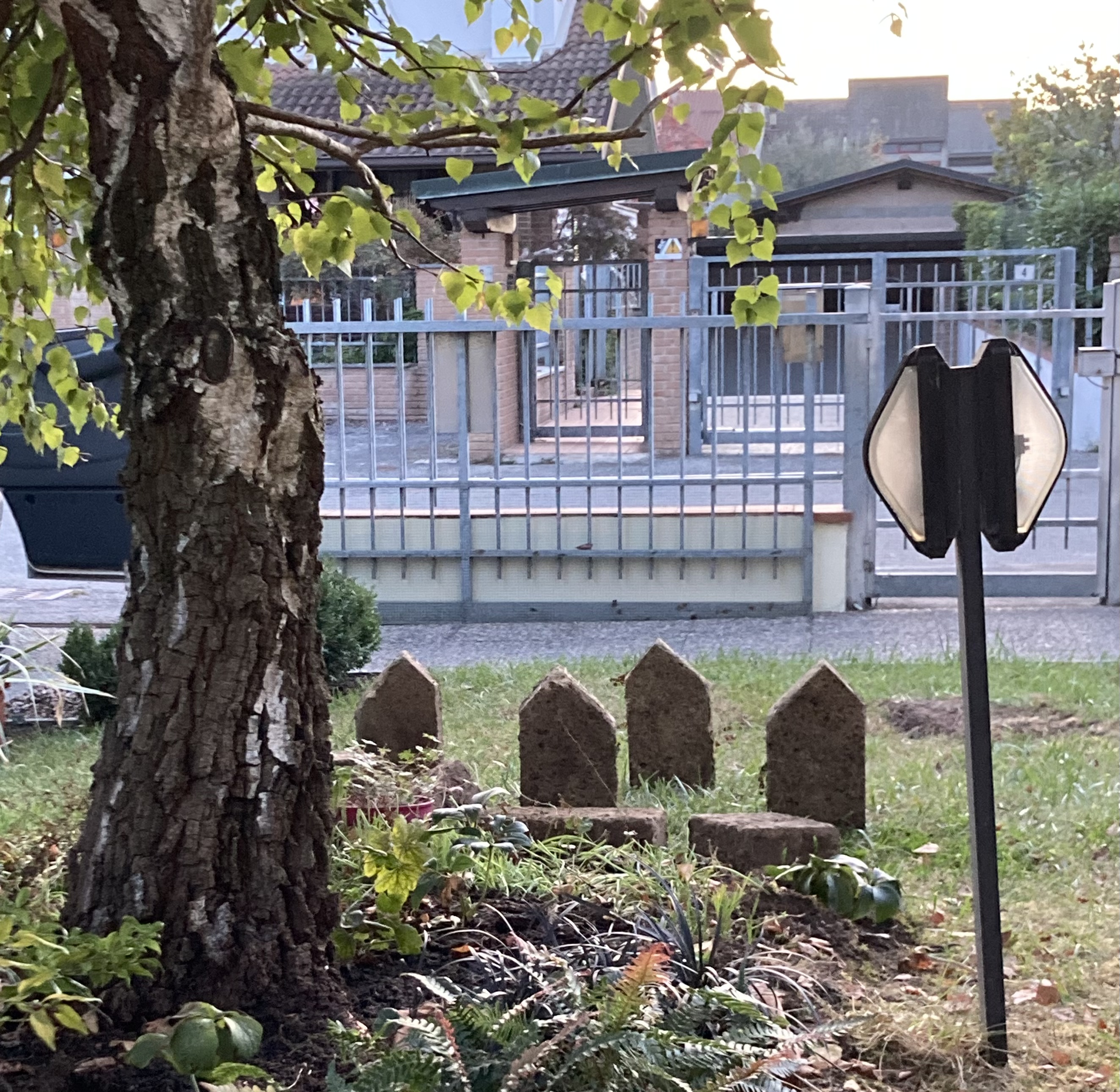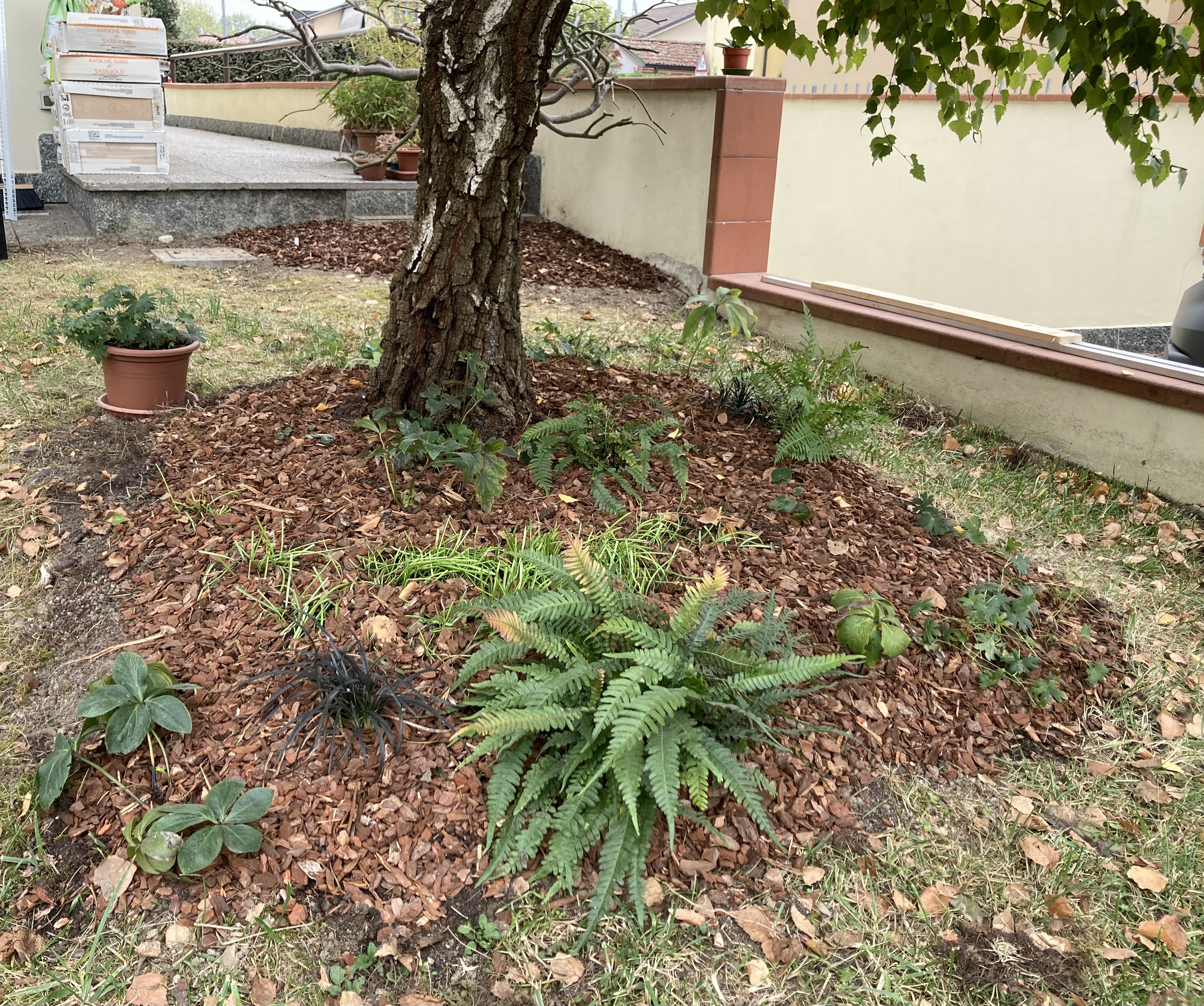 Prima, sotto alla betulla c’era un caos di blocchi di tufo e radici scoperte.. Un dislivello di 20 cm da colmare rispetto al piano dell’erba. Ora finalmente l’albero respira meglio ed ha per compagnia alcune piante più adatte, che col tempo ricopriranno la zona in modo più naturale
