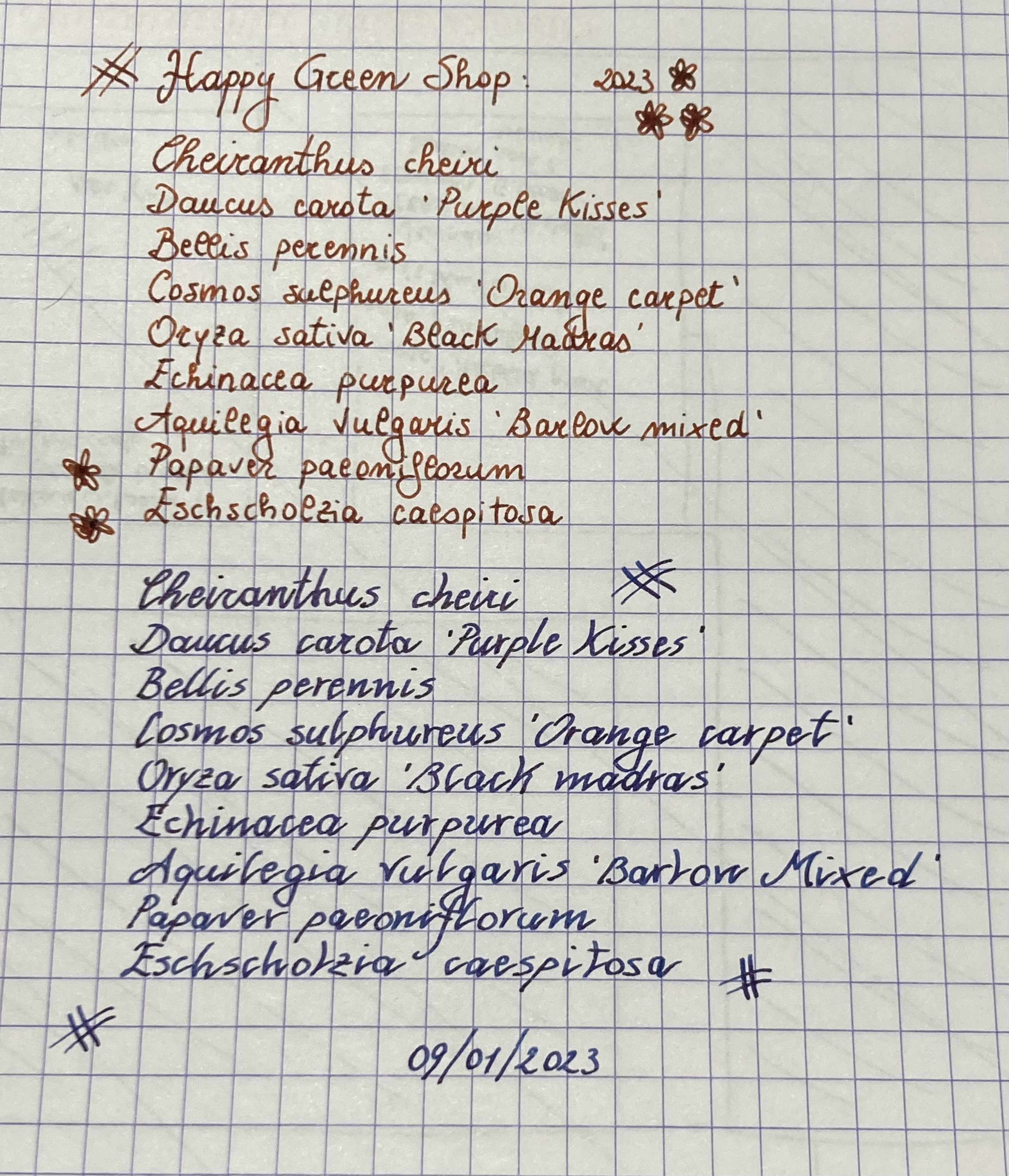 Ho scritto l’elenco dei semini comprati da un fornitore irlandese, con pennino elastic EF e con pennino elastic EF custom CSI, entrambi di Leonardo, con cui sto provando un nuovo “font”, che non mi riesce particolarmente bene