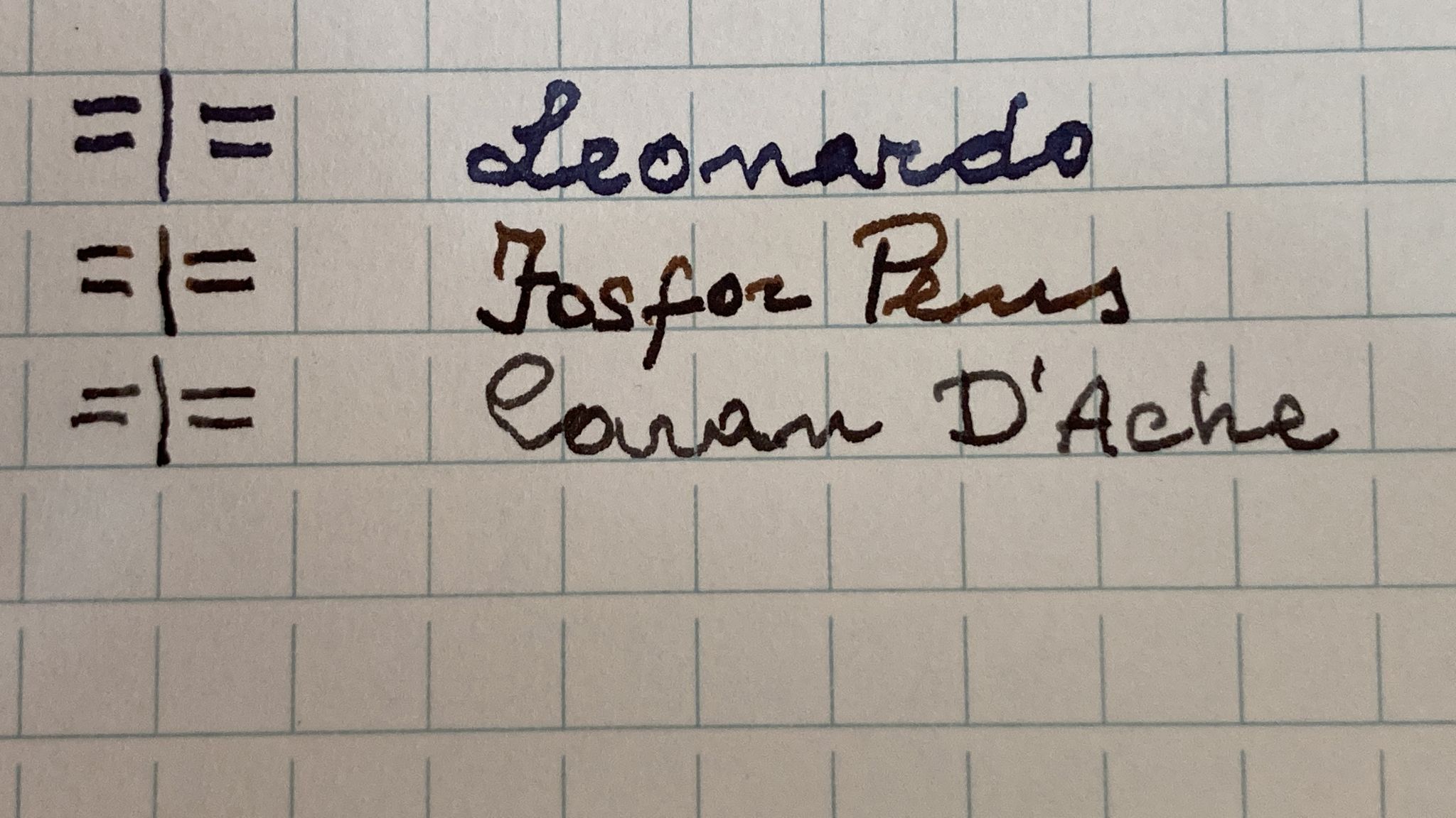 il testo della tua leonardo (pennino, da quanto ho capito, rifinito a mano da un nibmeister) mi pare avere variazione 3:1 (la r e la d), le altre due penne hanno variazioni minime, inferiori al 2:1 del pennino cinese (la P di pens e la A di ache)
