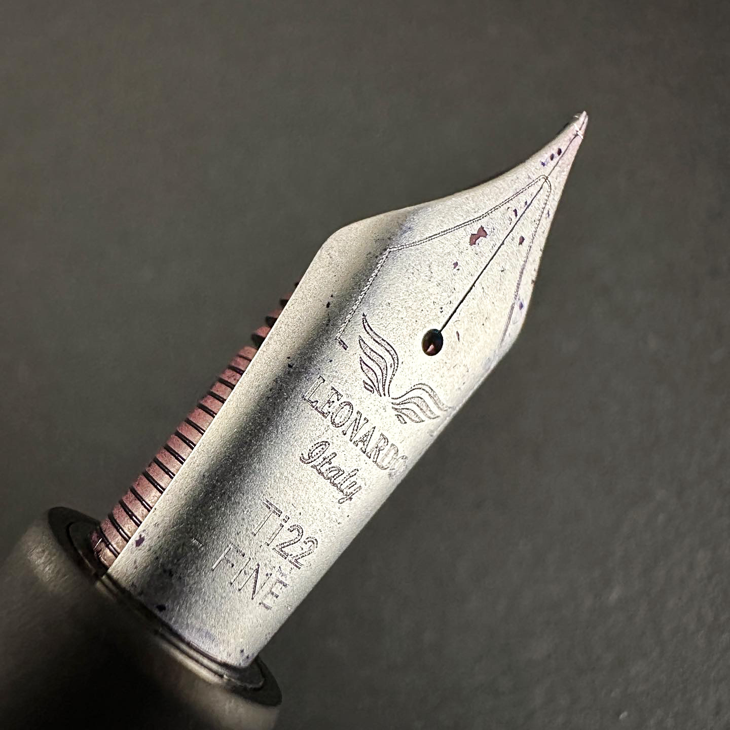 Il pennino in titanio che Francesco ha definito scugnizzo napoletano io ce l'ho nella gradazione CSI F sul modello Momento Zero Grande Primary Manipulation #1. Concordo con Francesco: i primi pennini di titanio che ha proposto Leonardo sono dei "flessibili con il trucco". La loro morbidezza aiutata dalle dimensioni del pennino #8 da' la sensazione di avere tra le mani un flessibile che, però, in realtà è un elastico. Il pennino presenta una superficie molto porosa ed un tono più scuro del palladio in cui sono fatte le metallerie.
