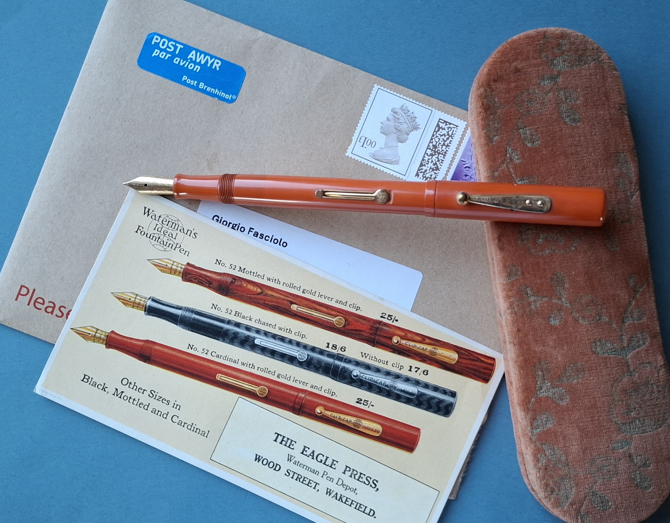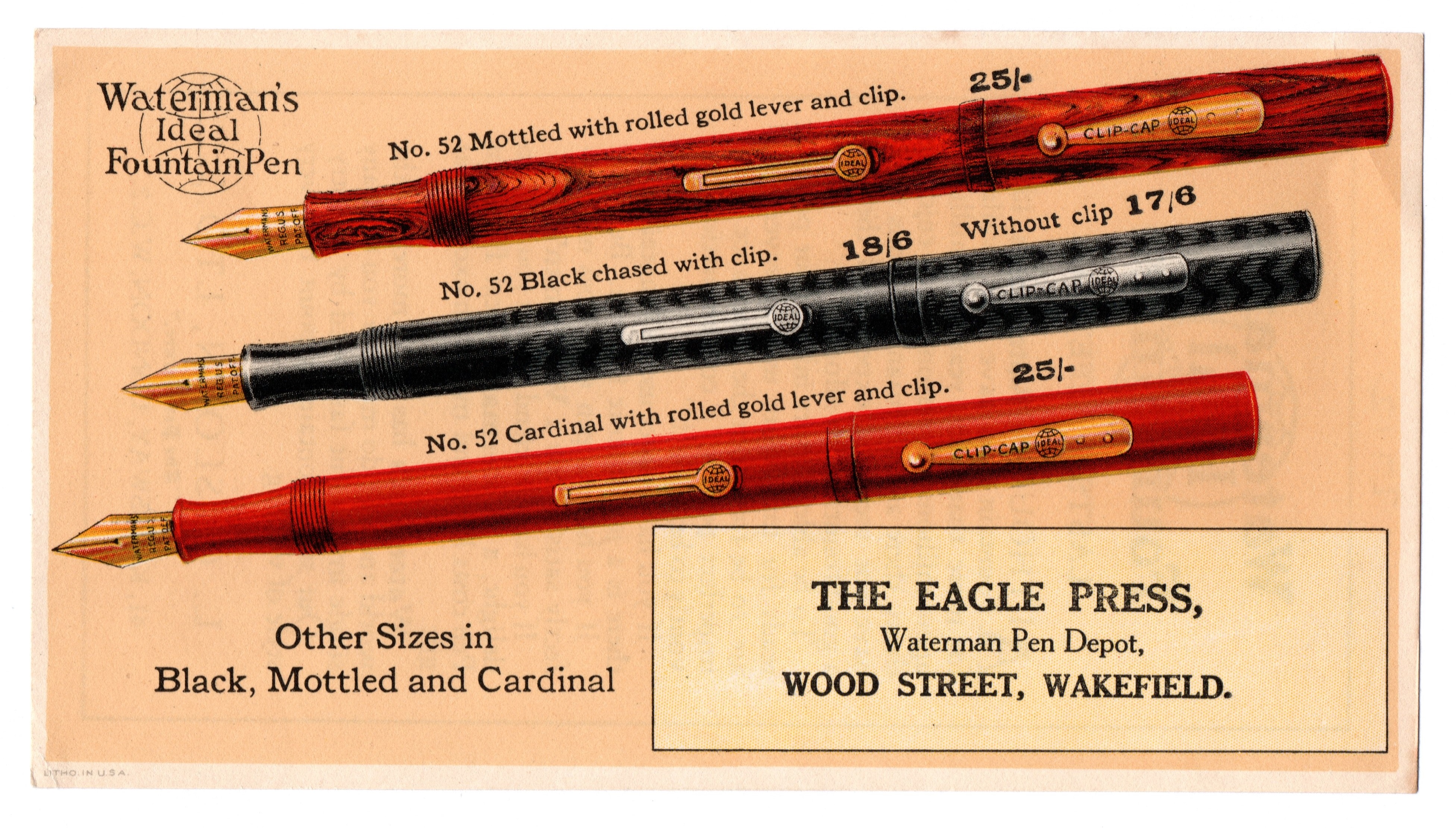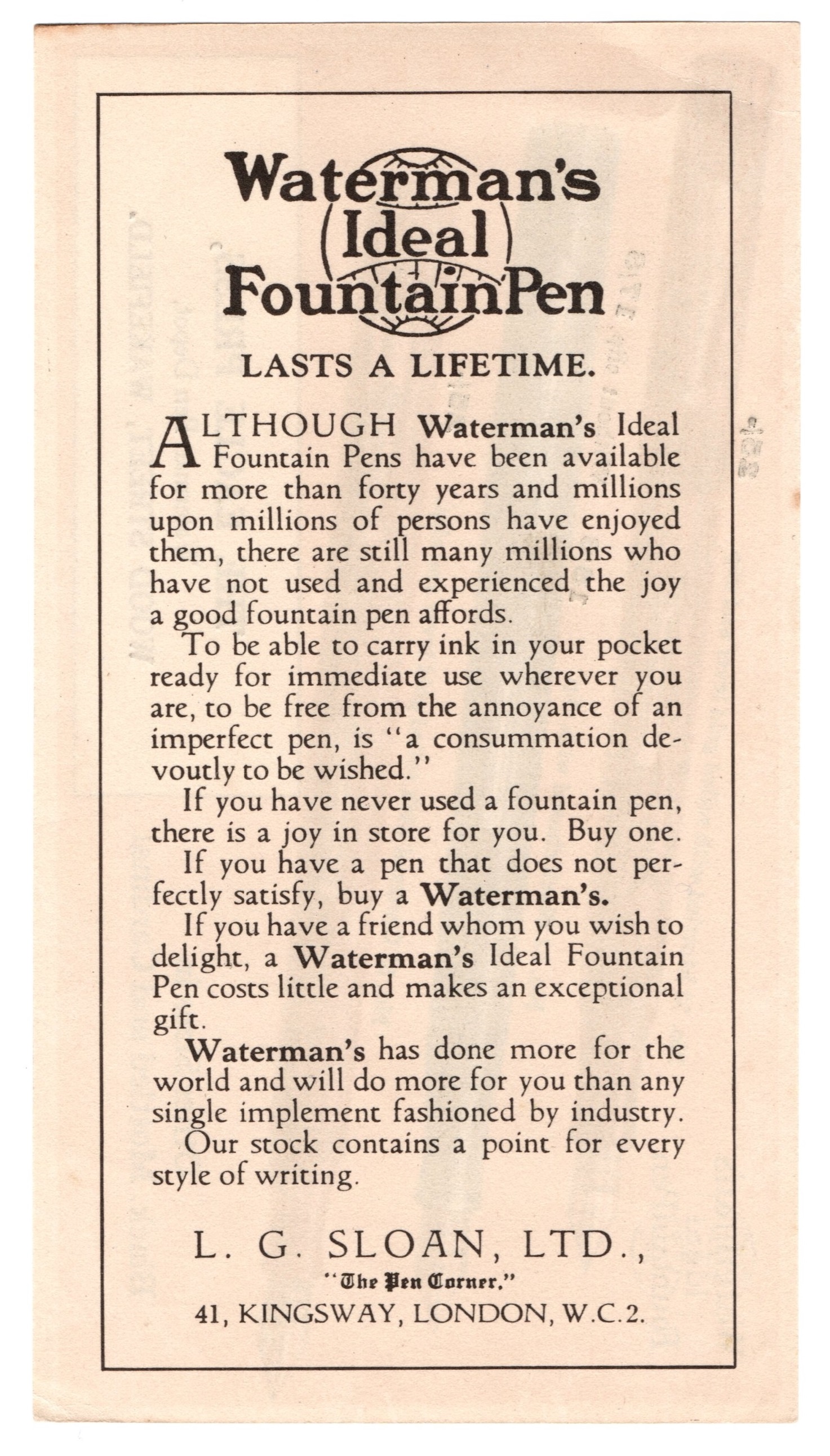Come apprendiamo dal retro del foglietto (che non utilizza caratteri “a pressione”), il committente principale della pubblicità era il Rappresentante inglese della Waterman’s,