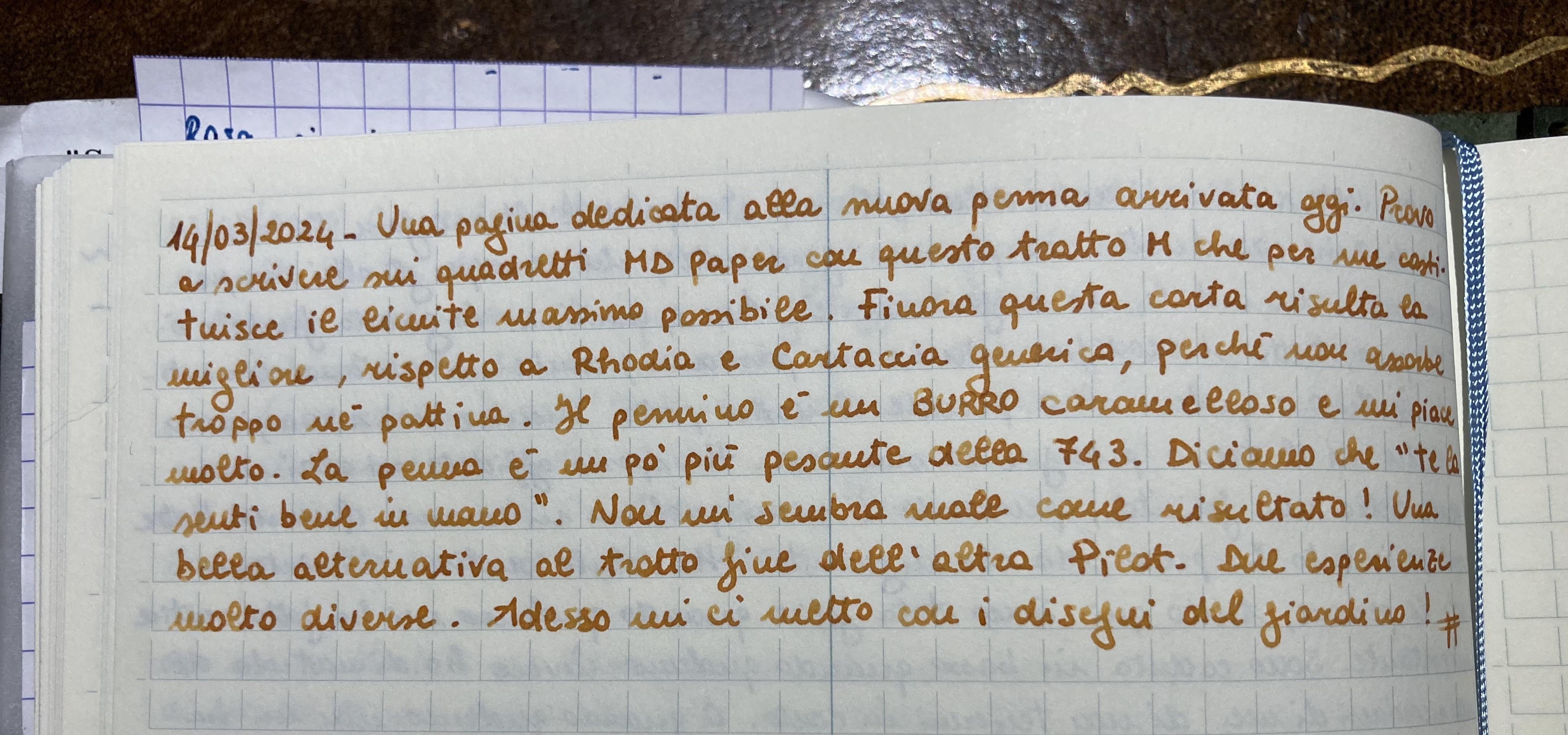 La penna è arrivata, funziona bene e ne sono soddisfatta. Il tratto M è abbastanza gestibile: per ora lo sto provando con un Pelikan Edelstein normalmente un po’ asciutto, ma al termine della carica proverò con lo Scabiosa e poi ancora con inchiostri Pilot che possiedo, così da farmi un’idea generale del comportamento del pennino con le varie opzioni. Rispetto al tratto F c’è un bel salto, ma penso sia giusto così: sono esperienze diverse ed ugualmente godibili, secondo l’umore e la giornata.