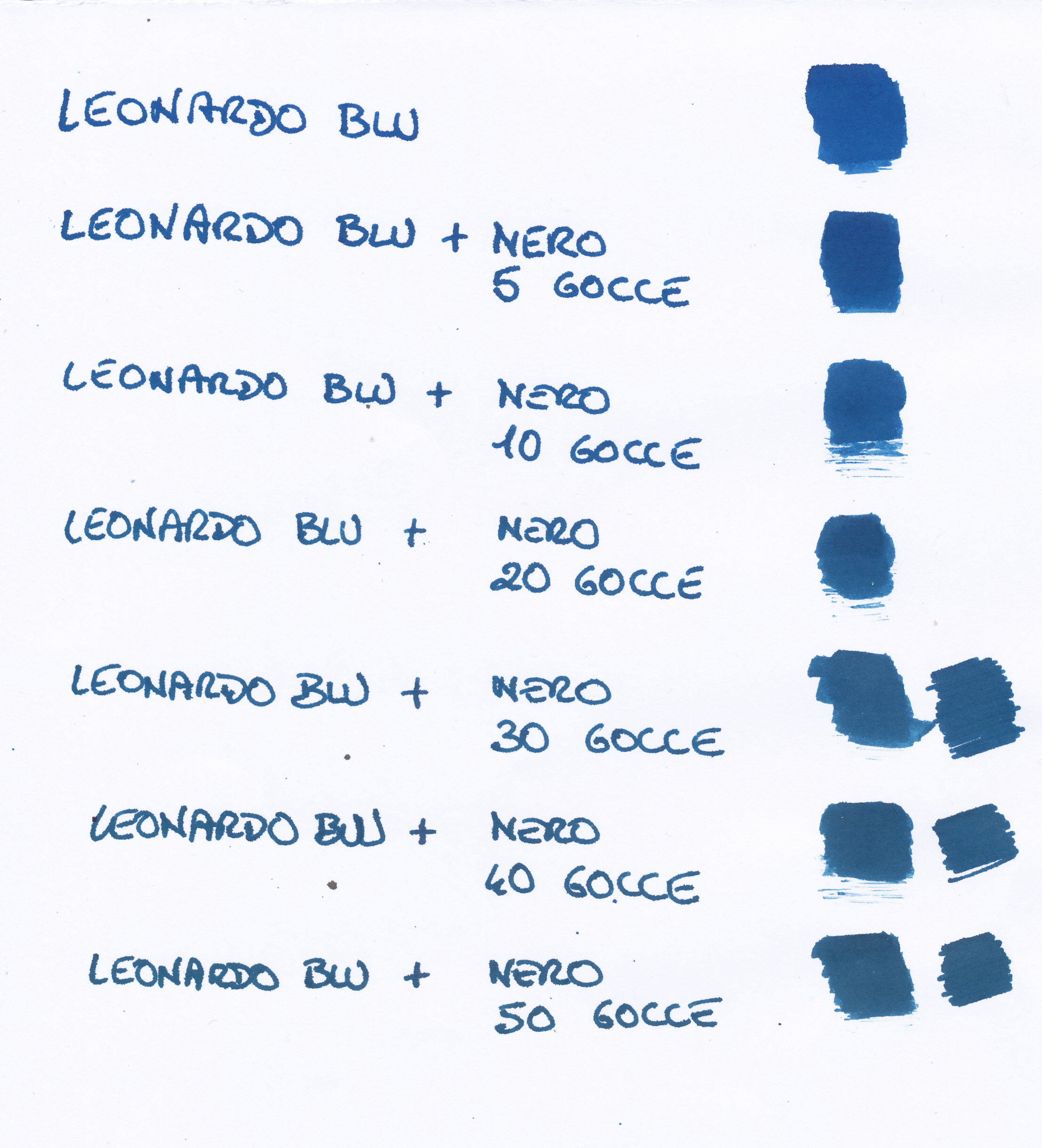 L'impressione che ho avuto è che il Leonardo nero sia molto poco nero (un nero debole), ce n'é voluto una valanga e ancora il risultato rimane molto chiaro, inoltre la componente turchese del Leonardo blu prevale, per cui con il nero si forma un turchese scuro.