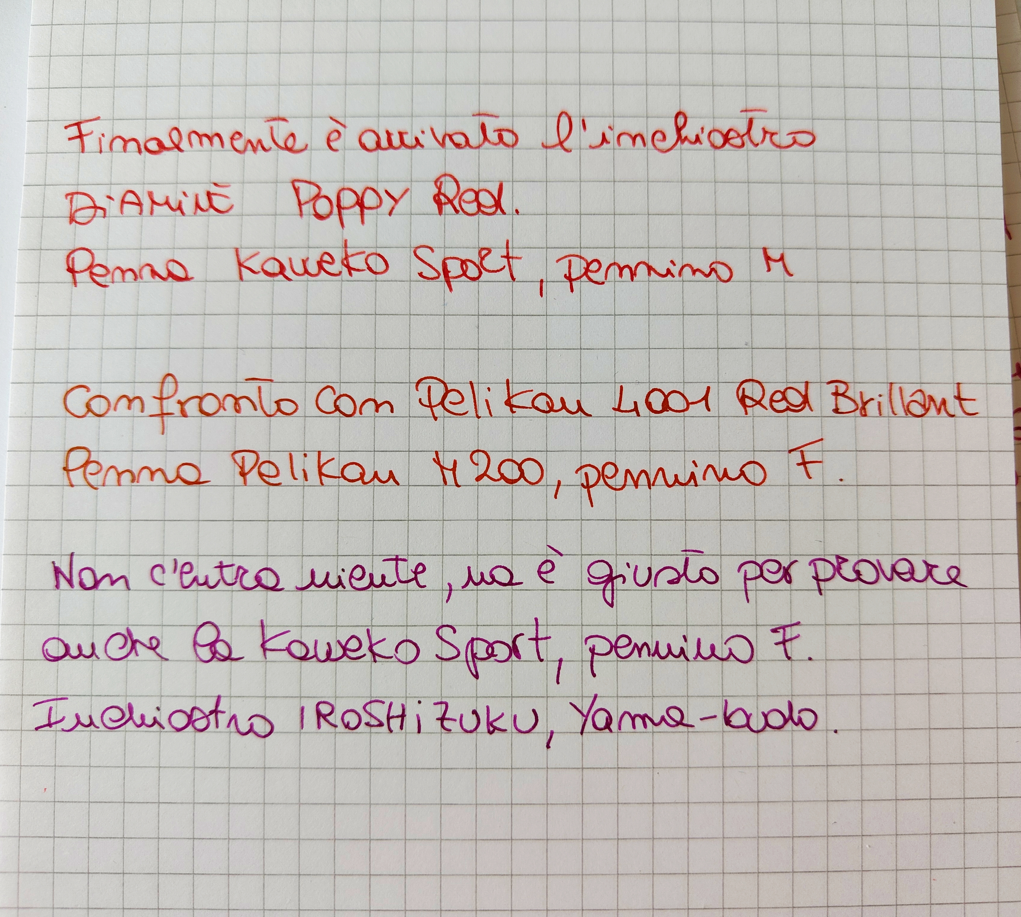 Il Poppy è un rosso "scolastico", per questo dopo un po' mi ha stancato. Il Syrah e l'Ancient Copper oggi sono i miei preferiti.Spiller84 ha scritto: ↑domenica 5 maggio 2024, 23:48 Un rosso bello vivo (qualcuno lo ha definito angry teacher red) è il Poppy Red della Diamine, e fino ad ora non mi ha dato nessun problema di pulizia o intasamenti. A me poi piace molto anche il Syrah, ma è più sul borgogna. Mi ha sporcato un po' un converter, ma solo il gommino, non il serbatoio trasparenteche cosa strana però