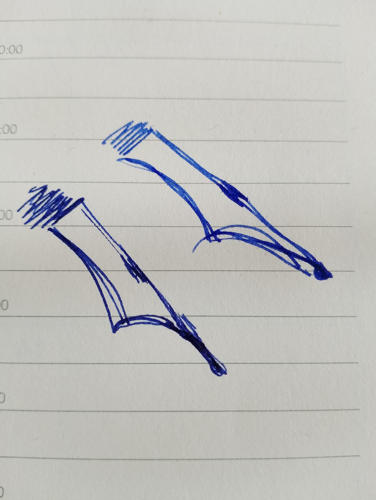 stessa cartuccia inchiostro blu stabilo, la prima penna nuova, la seconda in basso penna recuperata