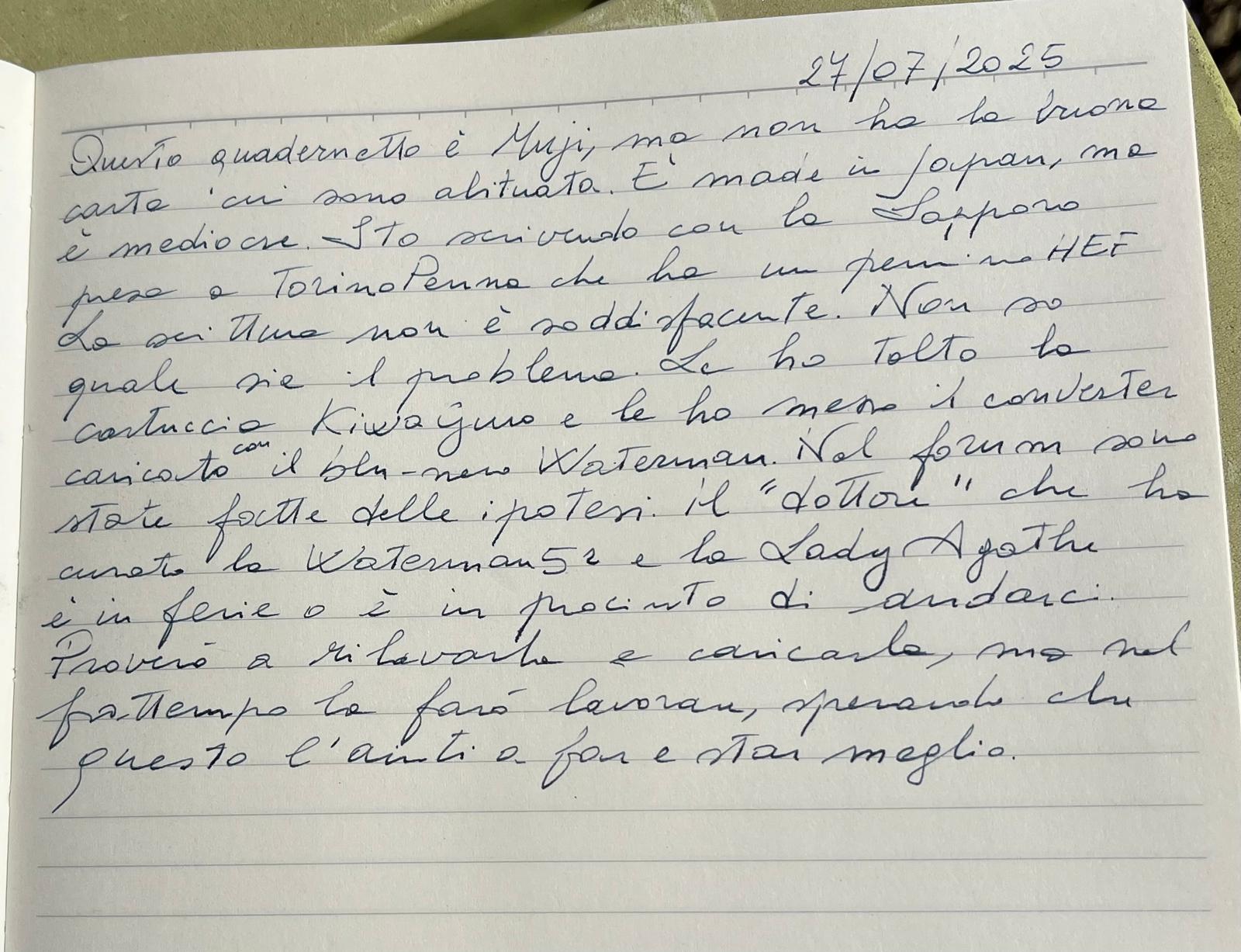 Nel caso, più avanti, quando potrai, molto parzialmente (se non hai già provato) ti consiglio di provare con la Platinum 3776. Io ancora non ho provato l'UEF ma intendo farlo quanto prima possibile. Ho tutti pennini EF e F. E' una penna dal flusso facile, con alcuni inchiostri è perfino abbondante, il pennino è affidabilissimo ed è più rigido dei Sailor, permettendo di essere dinamici con la scrittura senza inciampi dei rebbi che si separano e "mordono" il foglio. Ritengo che potresti trovarti molto bene.AinNithael ha scritto: ↑domenica 27 luglio 2025, 11:25Porca paletta! O meglio miseria! Le royalty del libro sono arrivate ieri, ma come sempre sono la dimostrazione di quanto la mia scrittura non sia molto amata, riuscirò a malapena ad acquistare la LECOULESimy ha scritto: ↑domenica 27 luglio 2025, 9:26