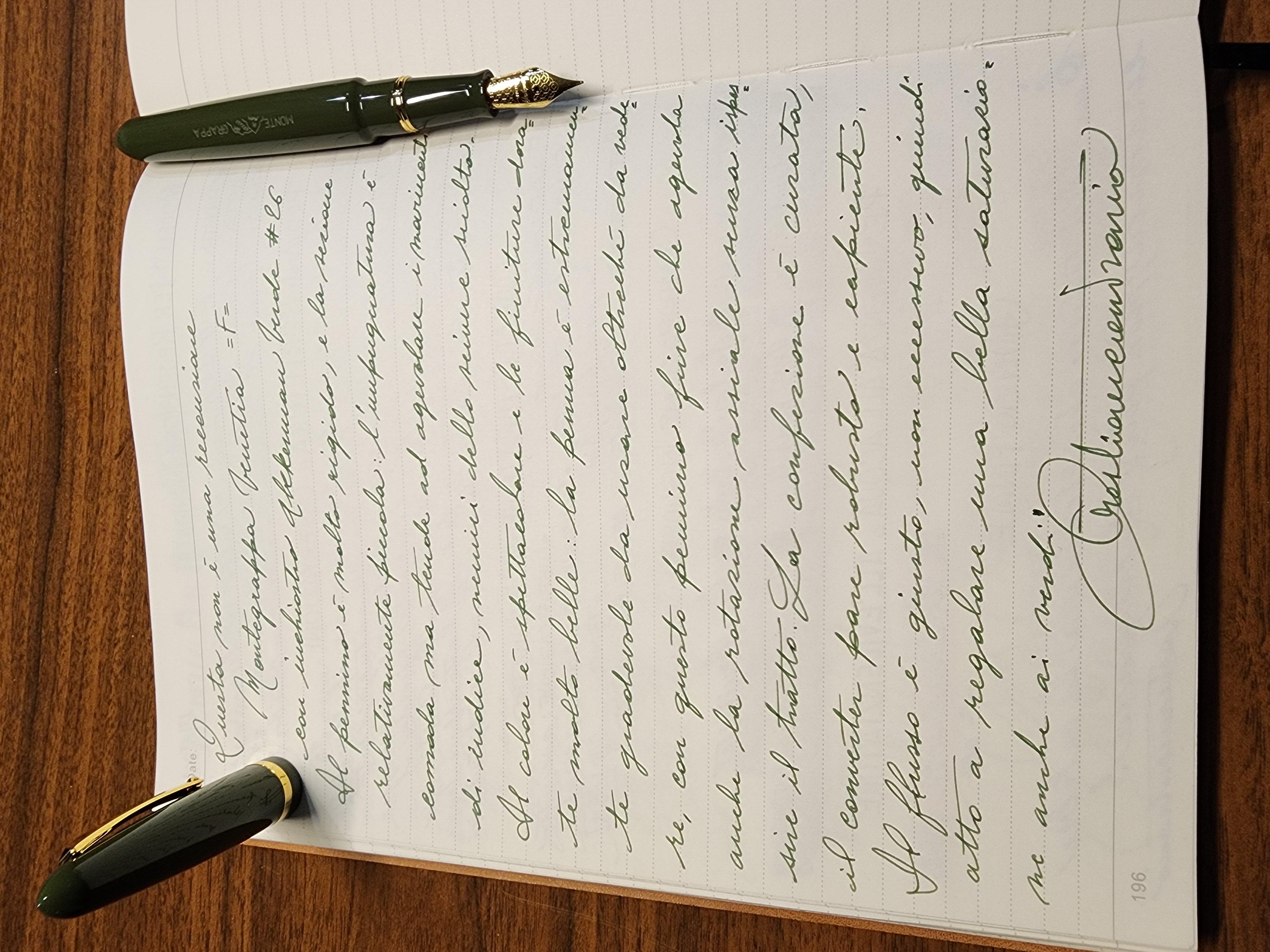 Pennino rigido, ma scorrevole come (quasi) sul burro, ha appena appena un accenno di feedback giusto per farti capire che stai scrivendo su della carta e non sull' olio.