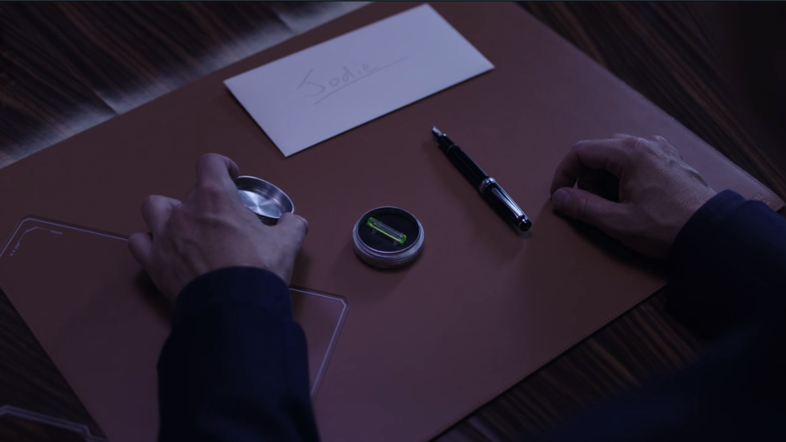 No, è che nelle prime due immagini stava finendo di scrivere gli appunti della giornata, solo nell'ultima firmava un atto...