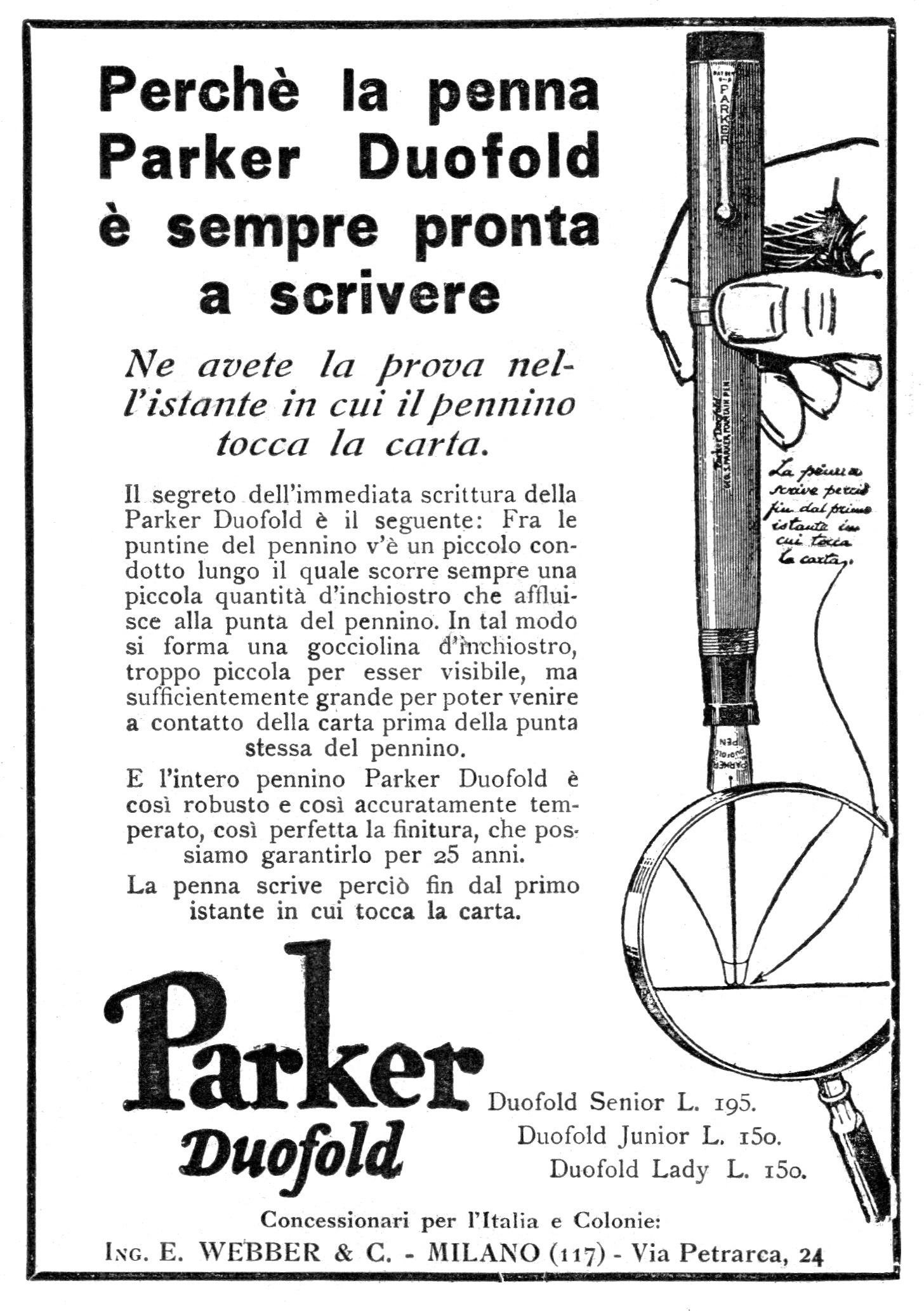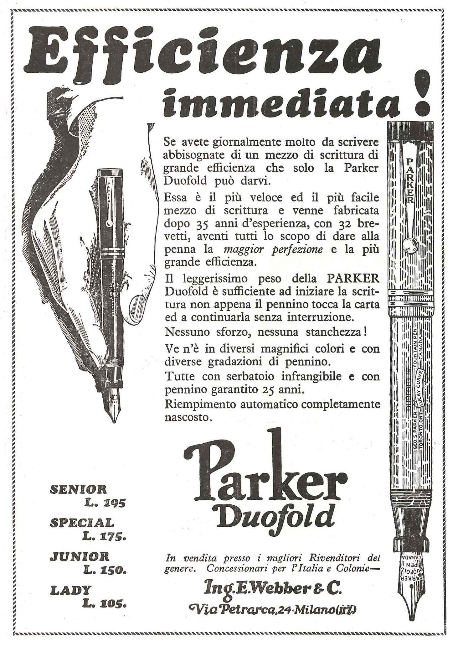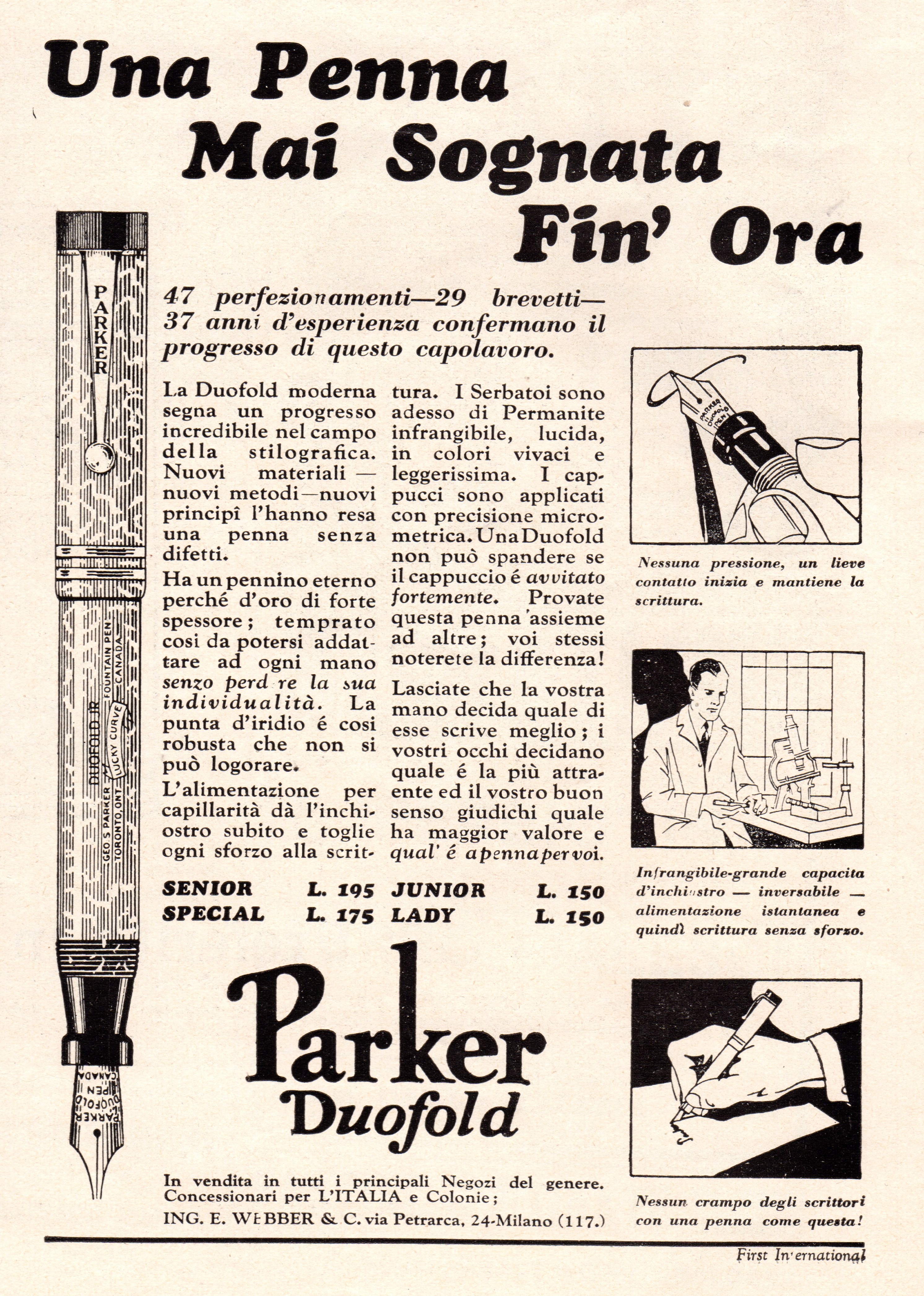 Proseguo sulla stessa rivista, ma con una marca diversa, Parker, con l'ammiraglia del tempo, la Duofold, in cui si inizia a promuovere una penna come "status symbol" più che per le caratteristiche tecniche...