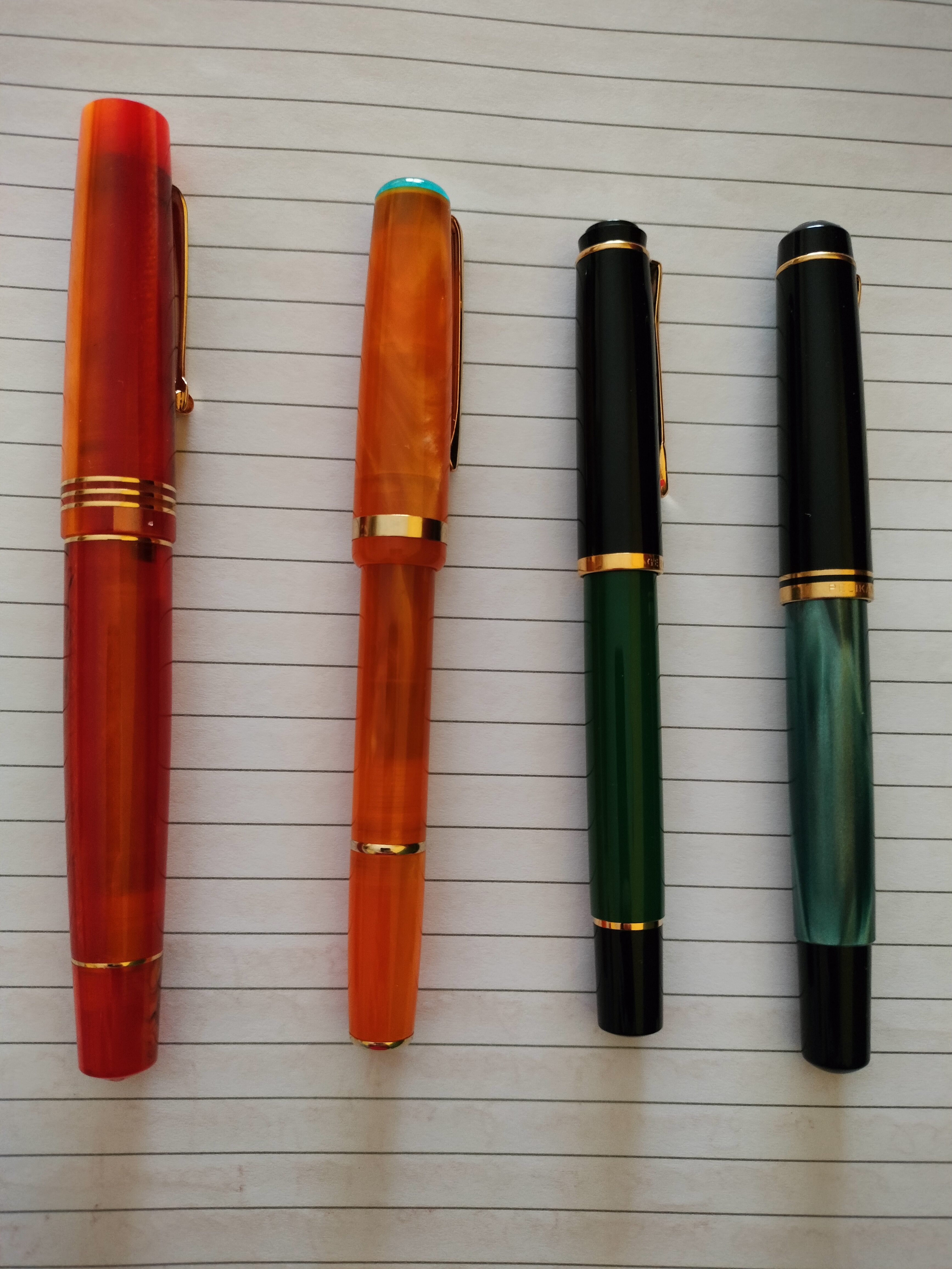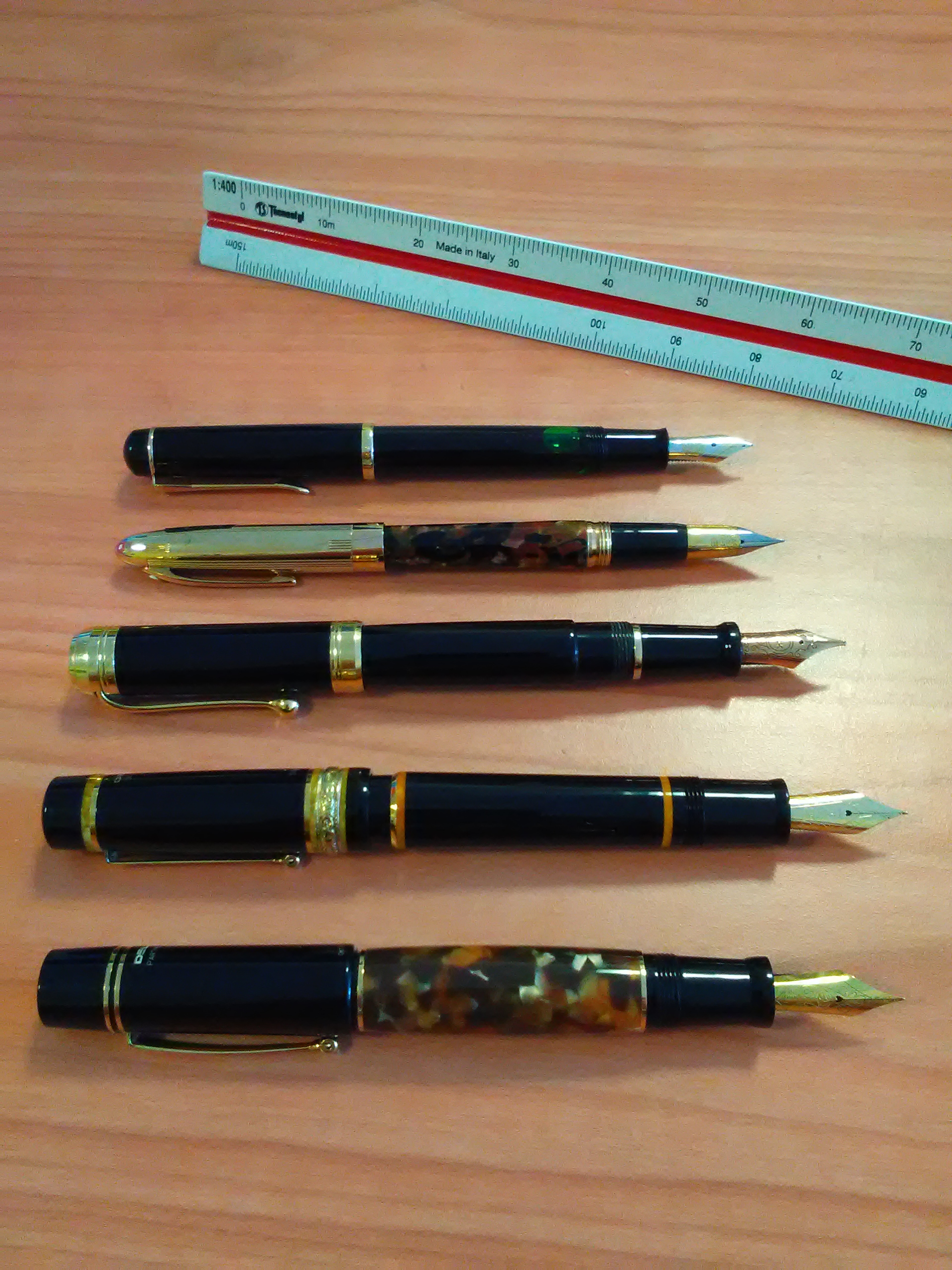 Da sx: Parker Duofold Centennial, Radius Superior, Leonardo Nuda, Parker Duofold Senior, Goldfink cusTom![]()