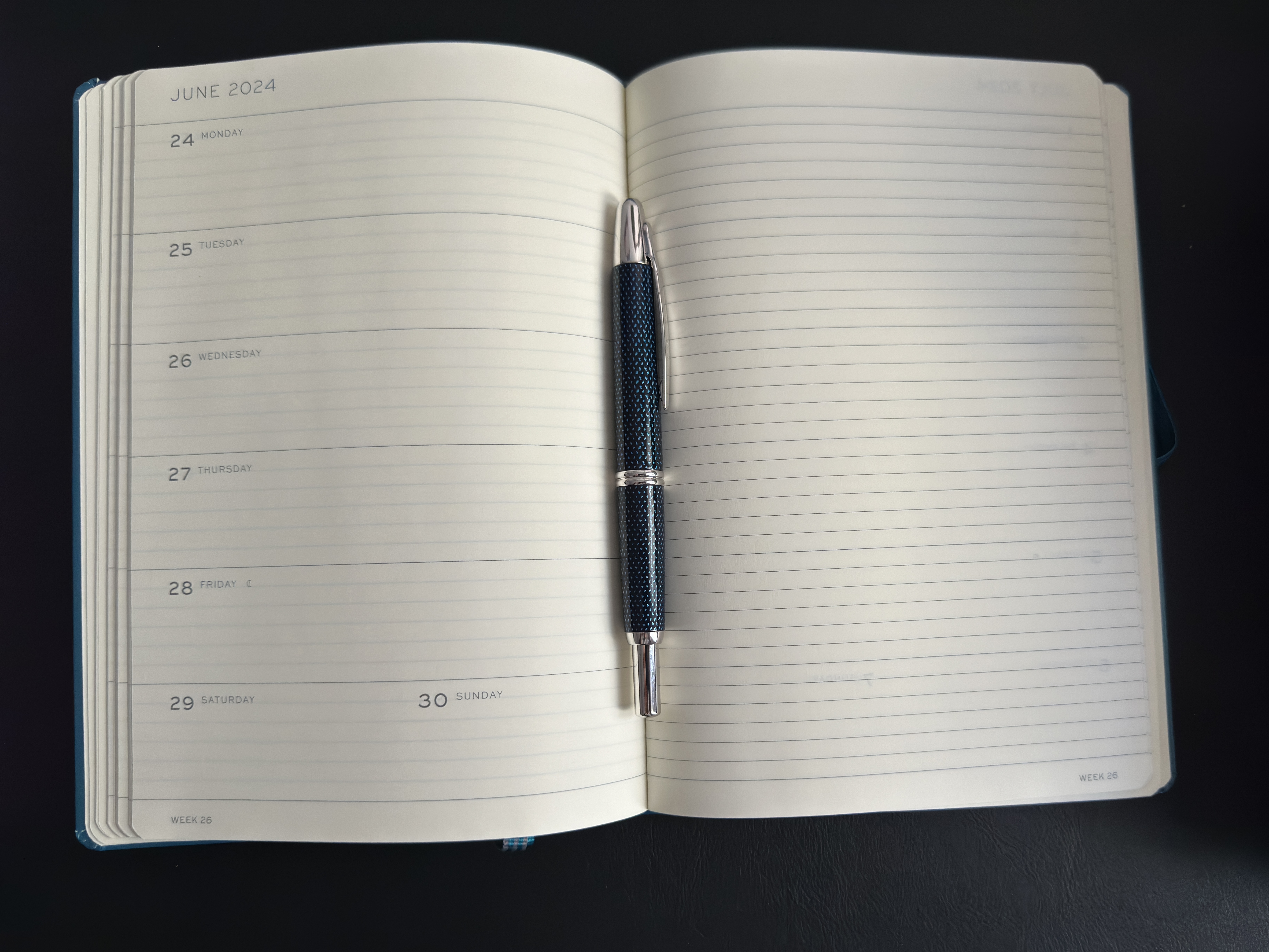 Leuchtturm1917 agenda 2024 formato A5 con copertina rigida e organizzazione settimanale. Per la prima volta anziché l’A6 ho scelto l’A5, vediamo se mi aiuta a usare di più l’agenda.