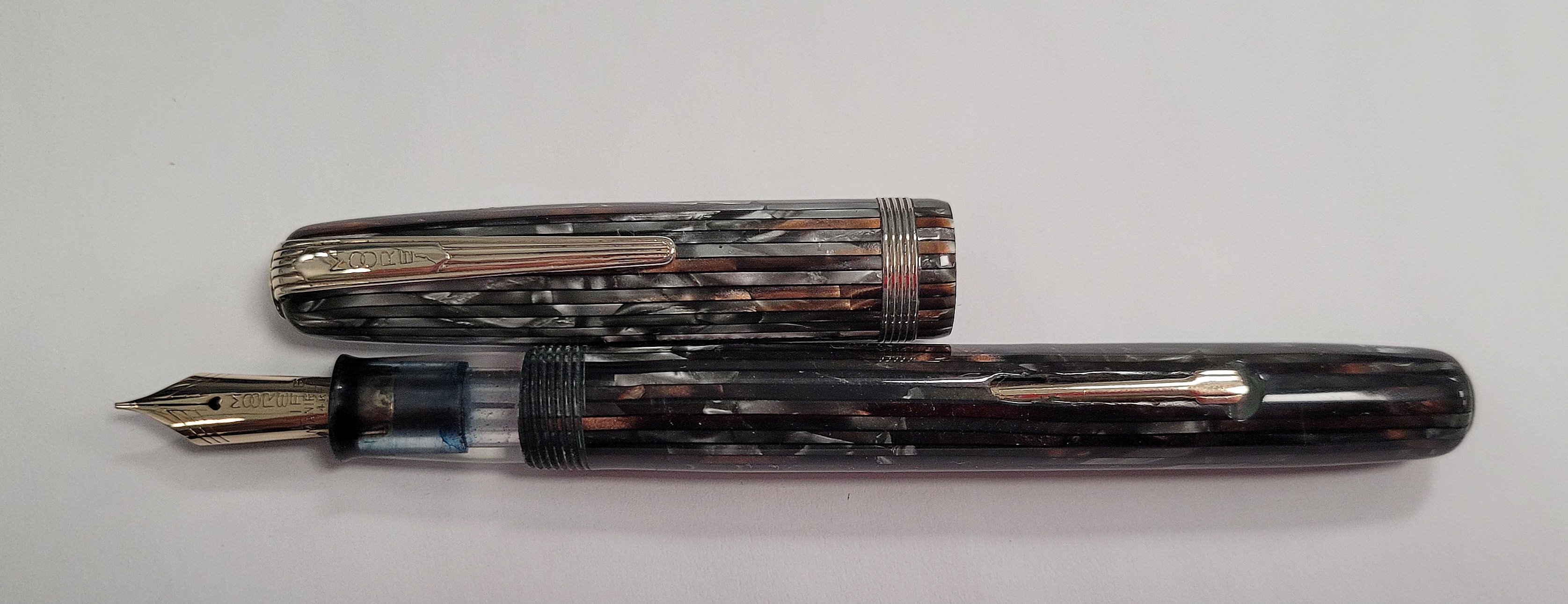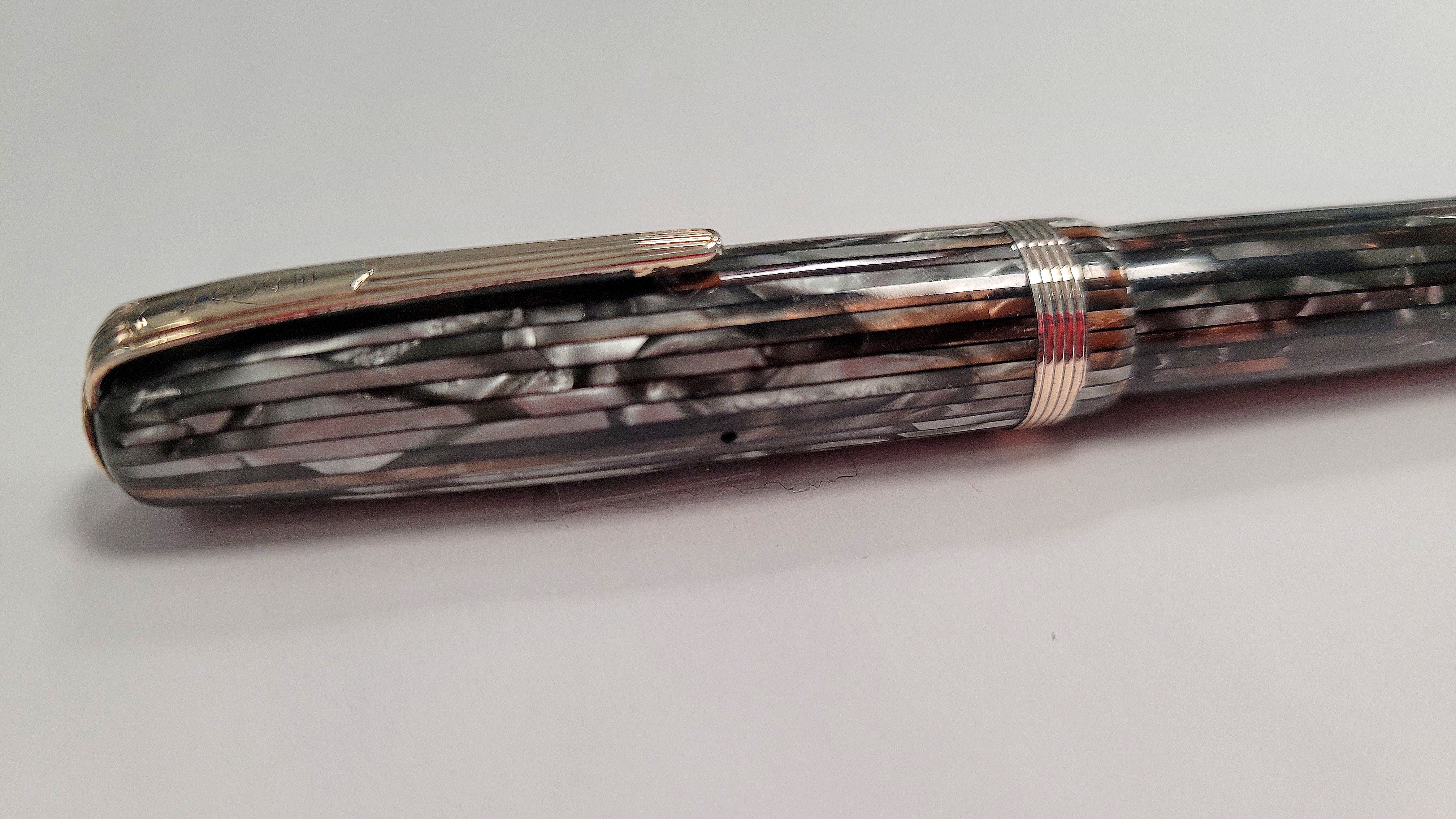 Stilografica anni '40 davvero carino il colore della celluloide striata nero, perla bronzo che mi ha catturato immediatamente.