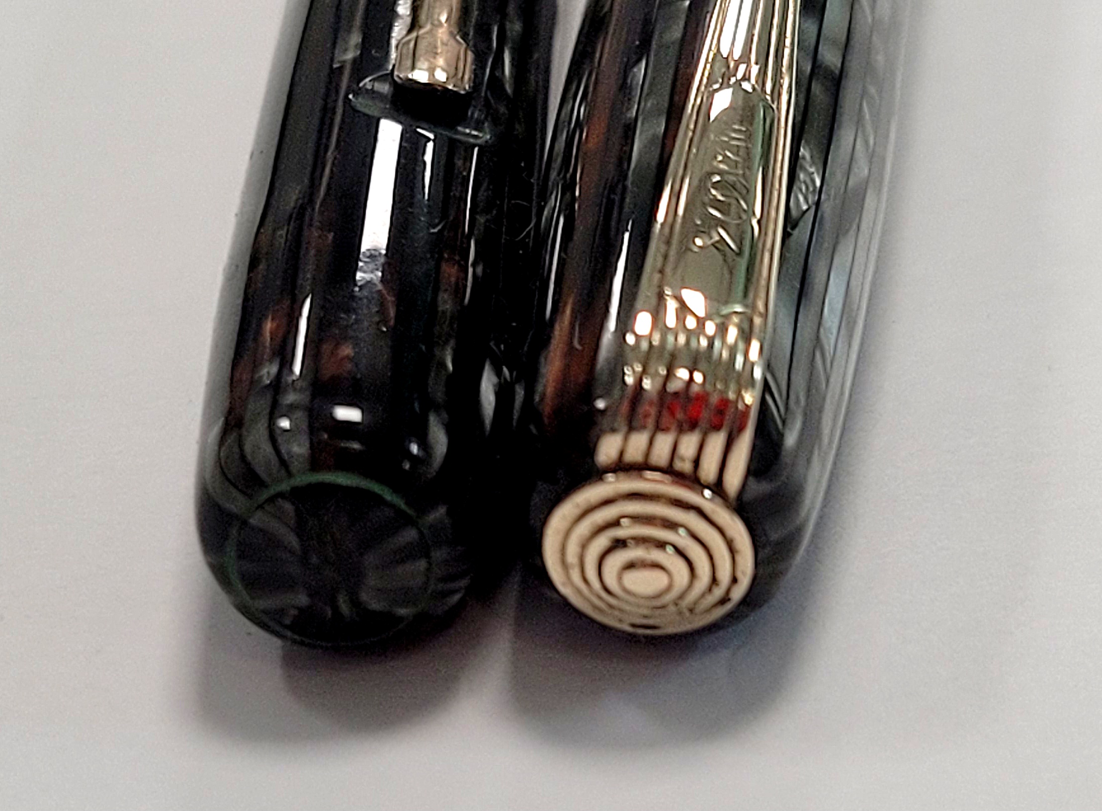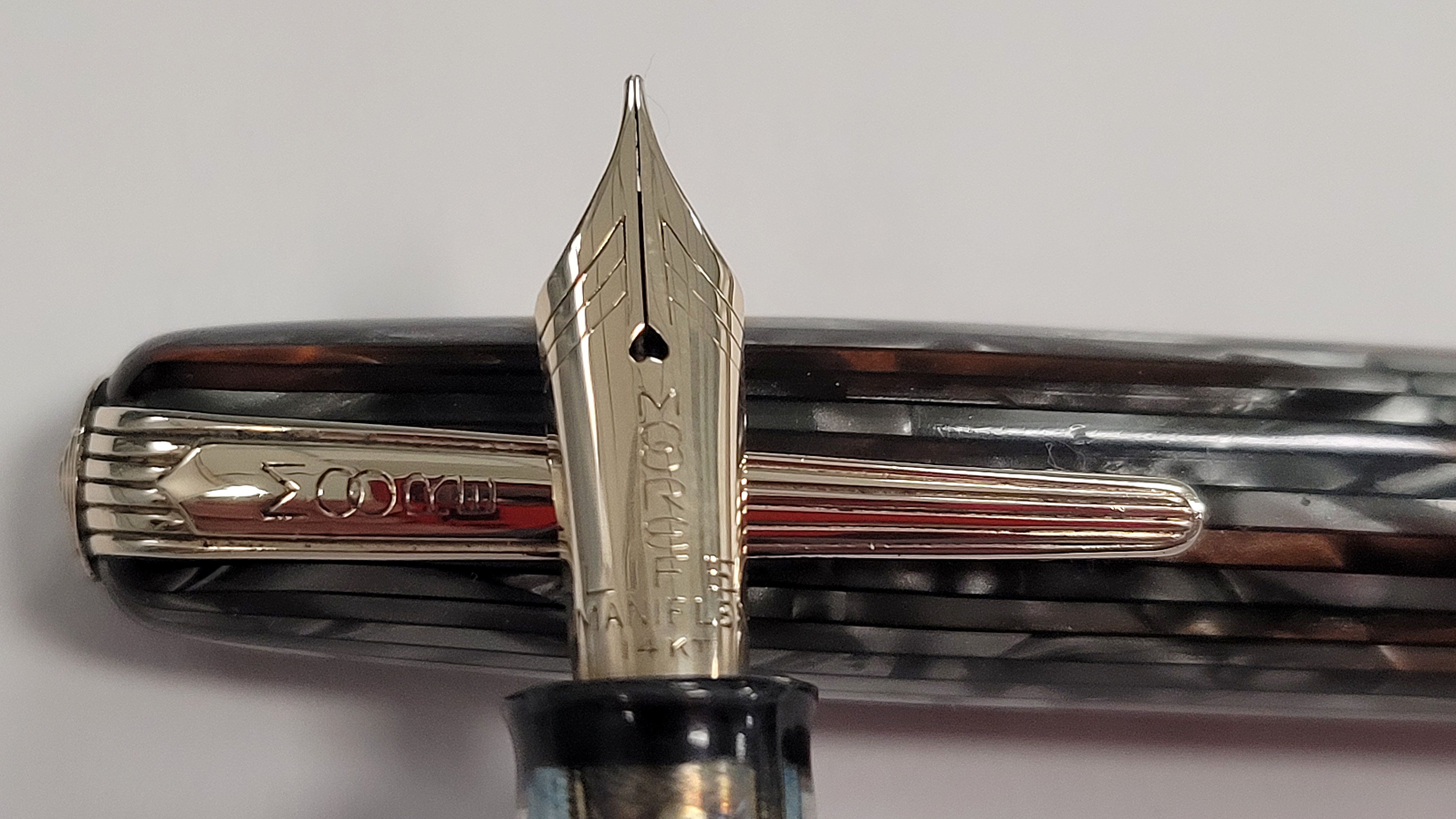 La celluloide era comune all'epoca, ma i 5 anellini (pentagramma) sono un omaggio al musicista creatore del primo famosissimo modello della Casa... :clap: Mentre il gioiello "stepped" (terrazzato, anch'esso "pentapartito") è semplicemente copiato da Waterman.