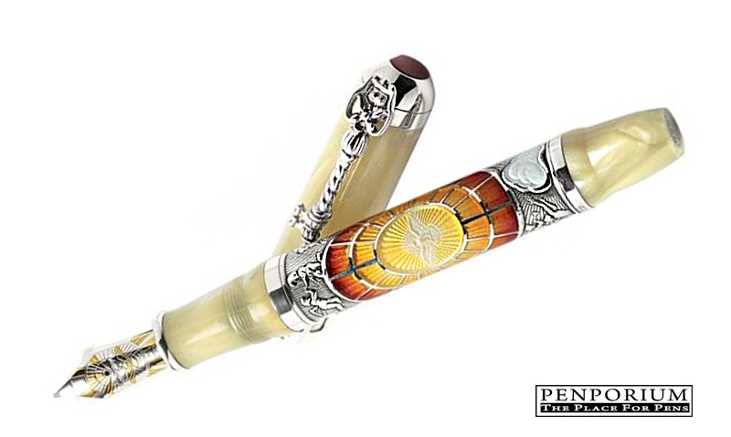 Un raggio di purezza e pace, come quello che deve aver visto Noè dal ponte dell'Arca, la penna viene presentata in un prezioso e nient'affatto ingombrante scrigno a forma di tronco di colonna romana del peso di soli dieci kg in marmo foderato di velluto: