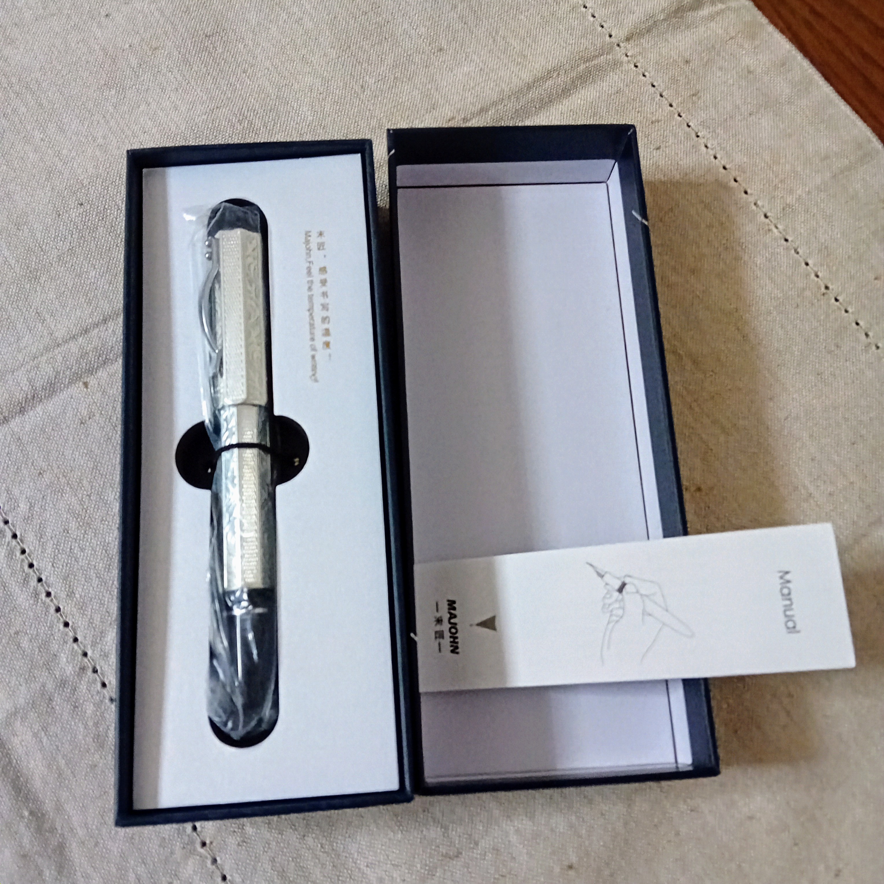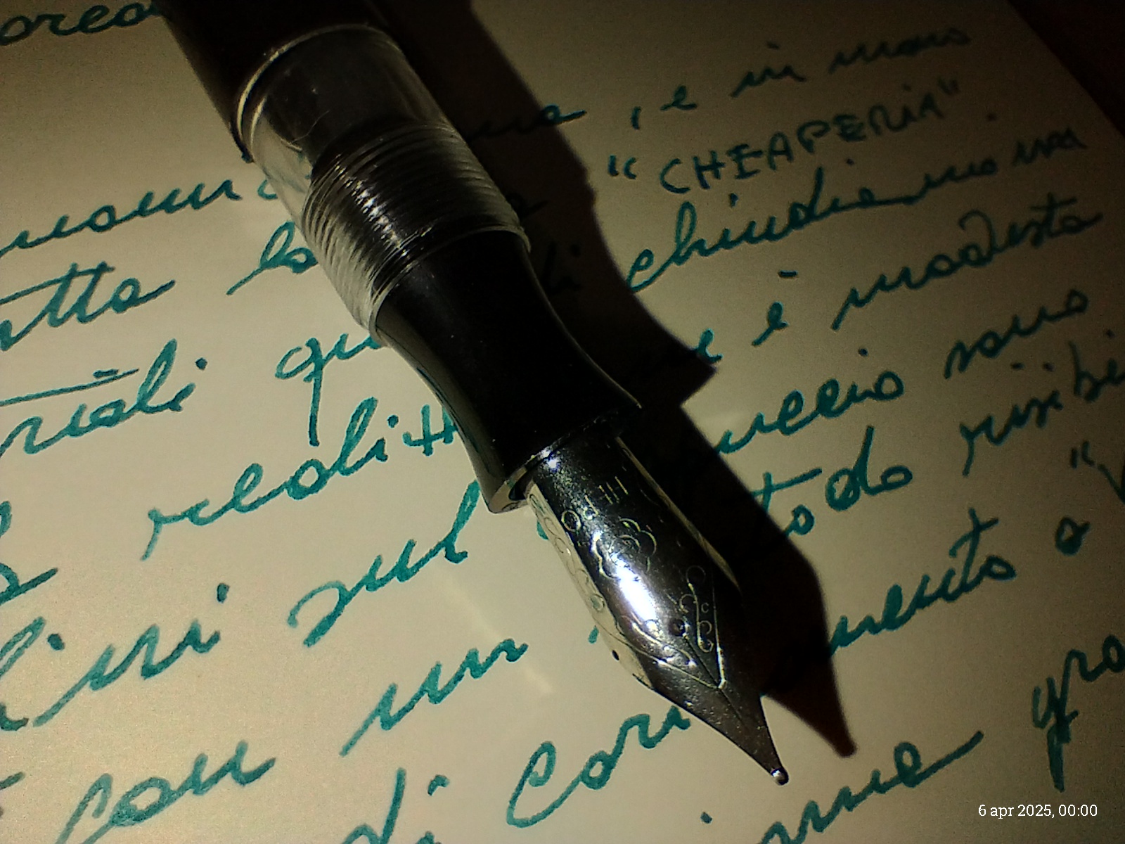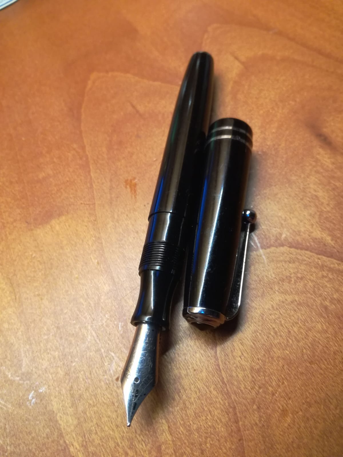 Arrivata ieri sera con la sua confezione, buona capacità di inchiostro, ha iniziato subito a scrivere, stamattina ripartita senza problemi. Pennino fine, lo stantuffo è molto scorrevole.