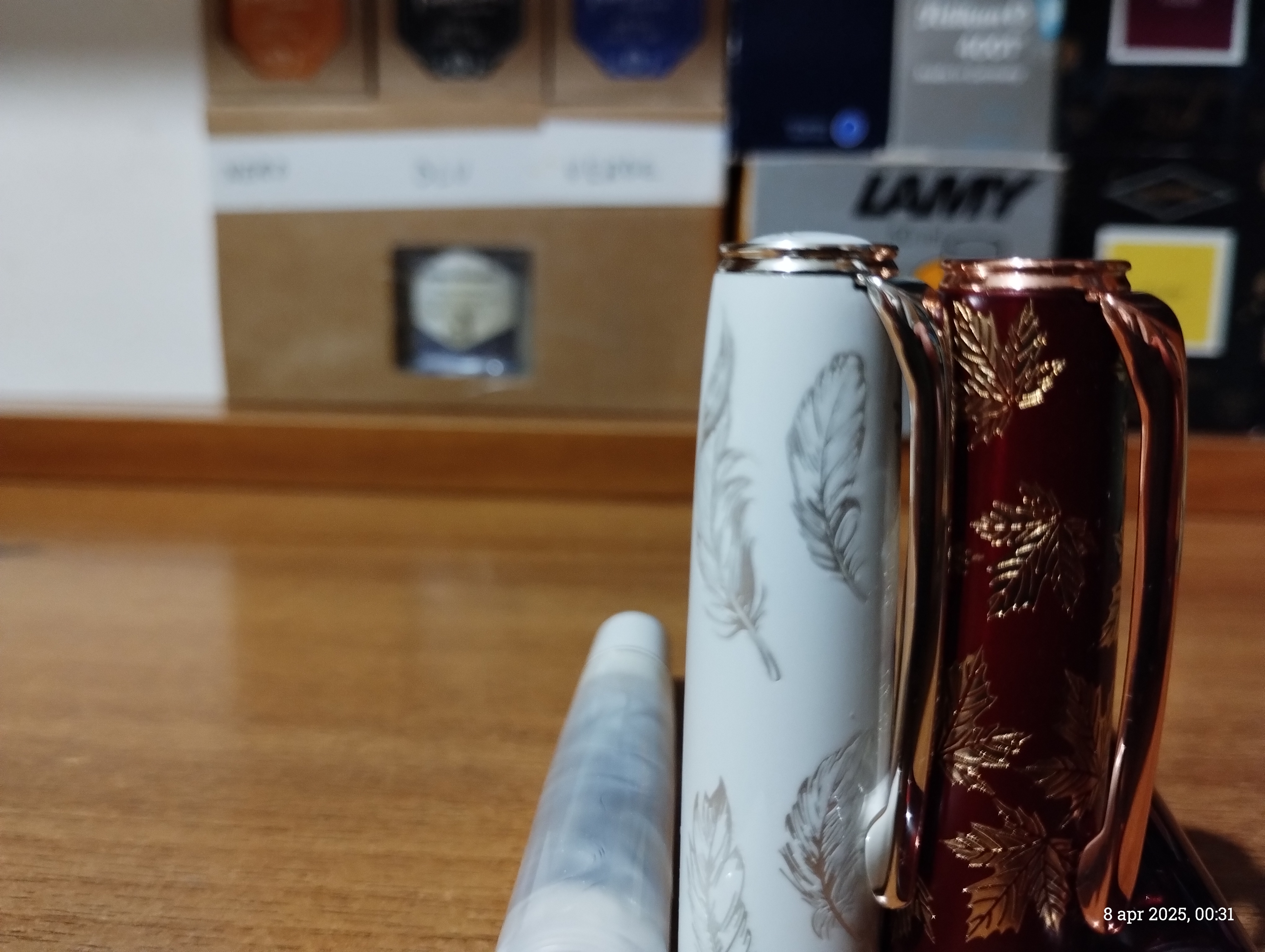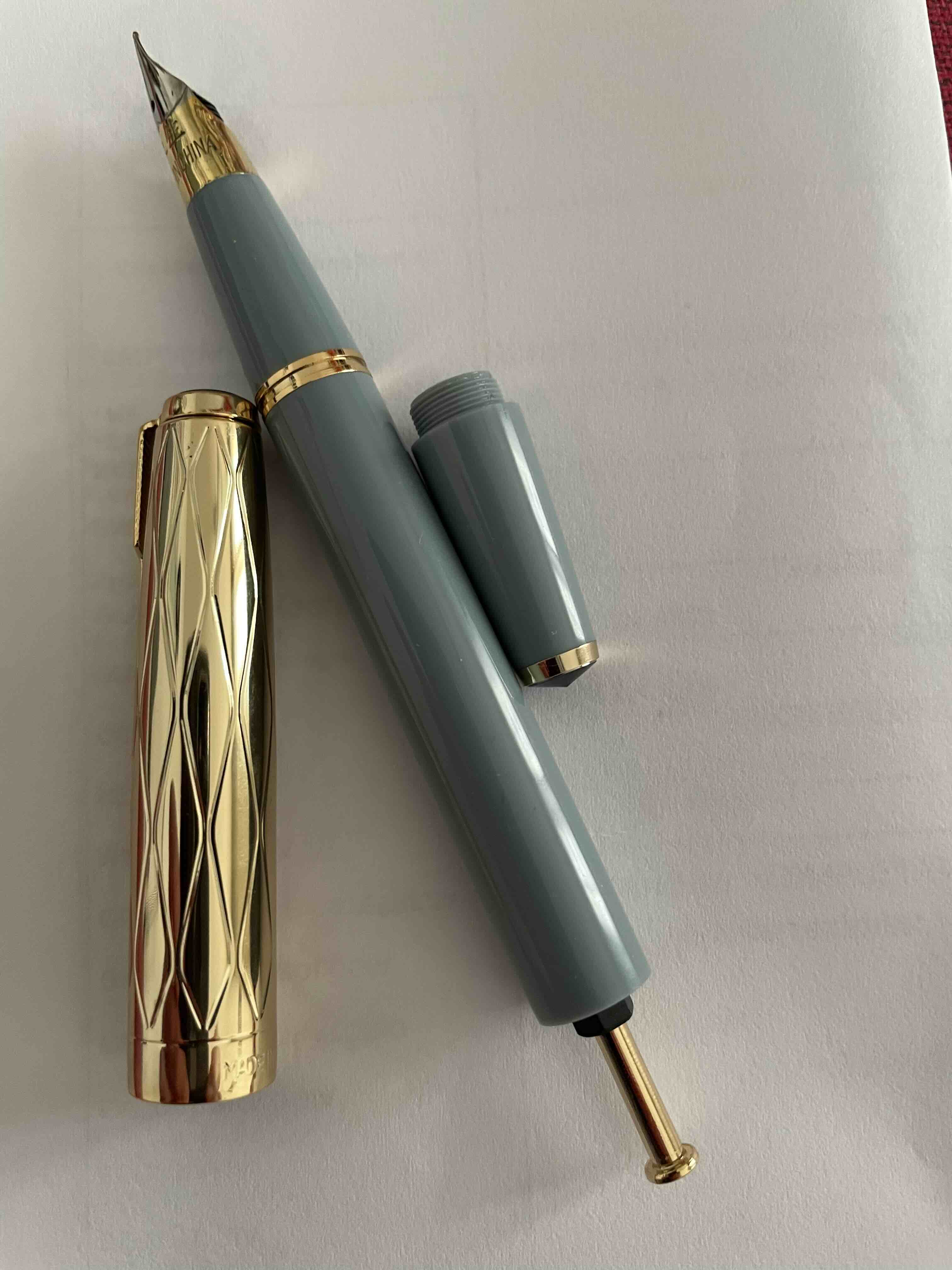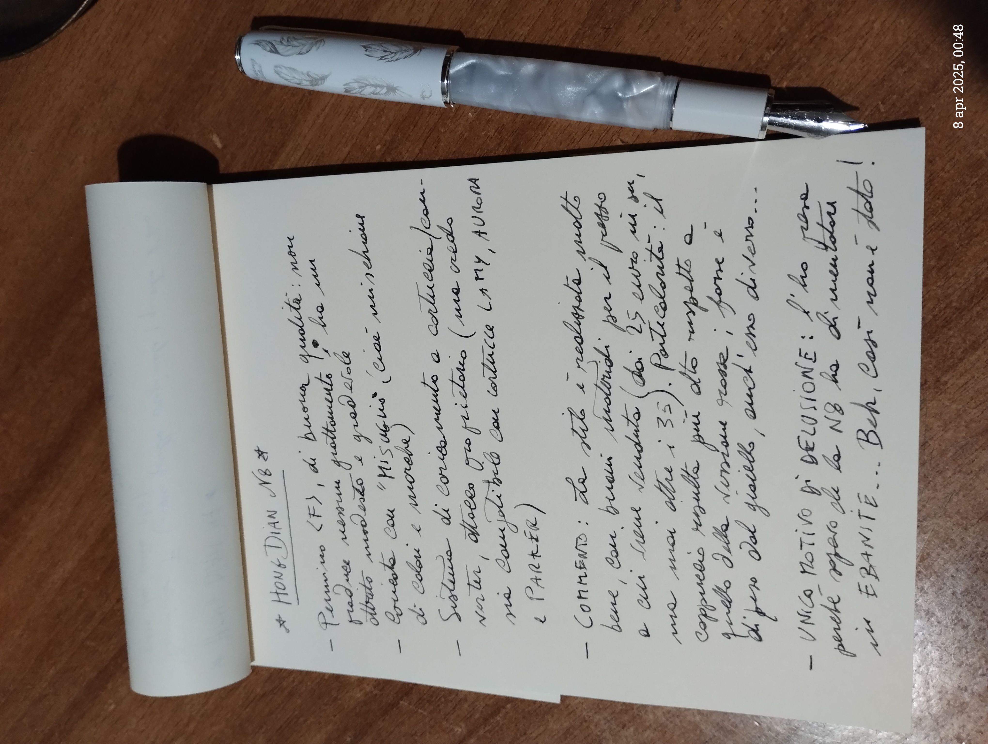 Arrivata ieri sera con la sua confezione, buona capacità di inchiostro, ha iniziato subito a scrivere, stamattina ripartita senza problemi. Pennino fine, lo stantuffo è molto scorrevole.